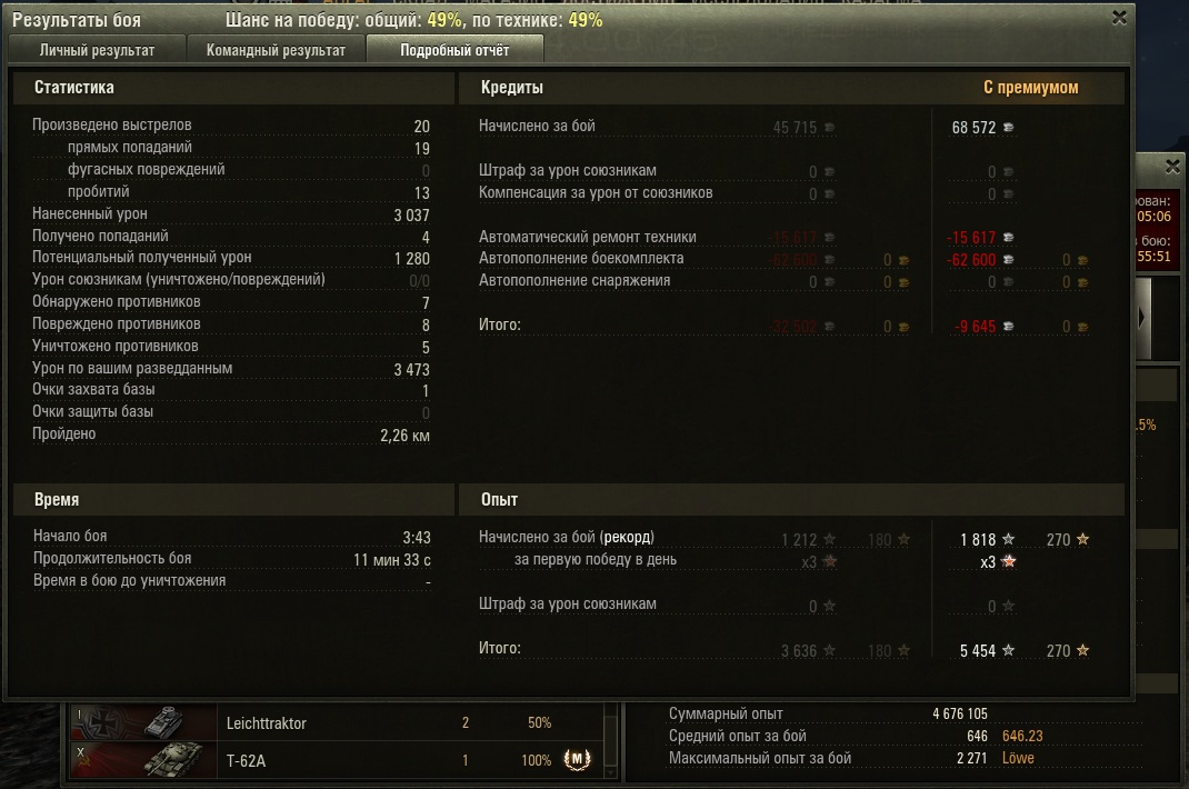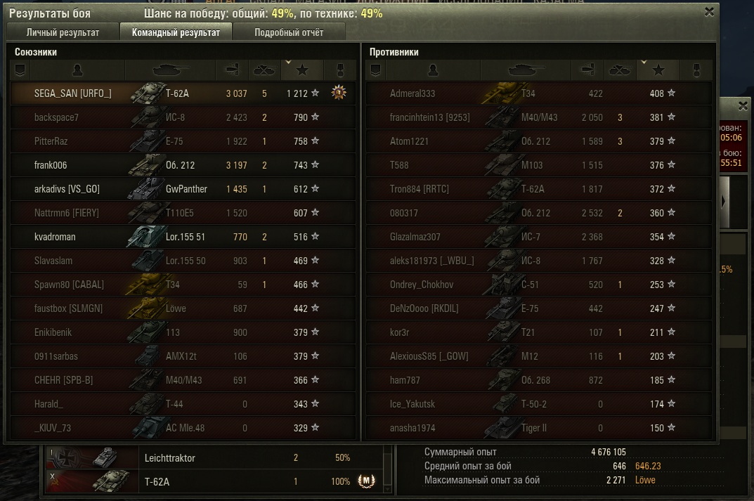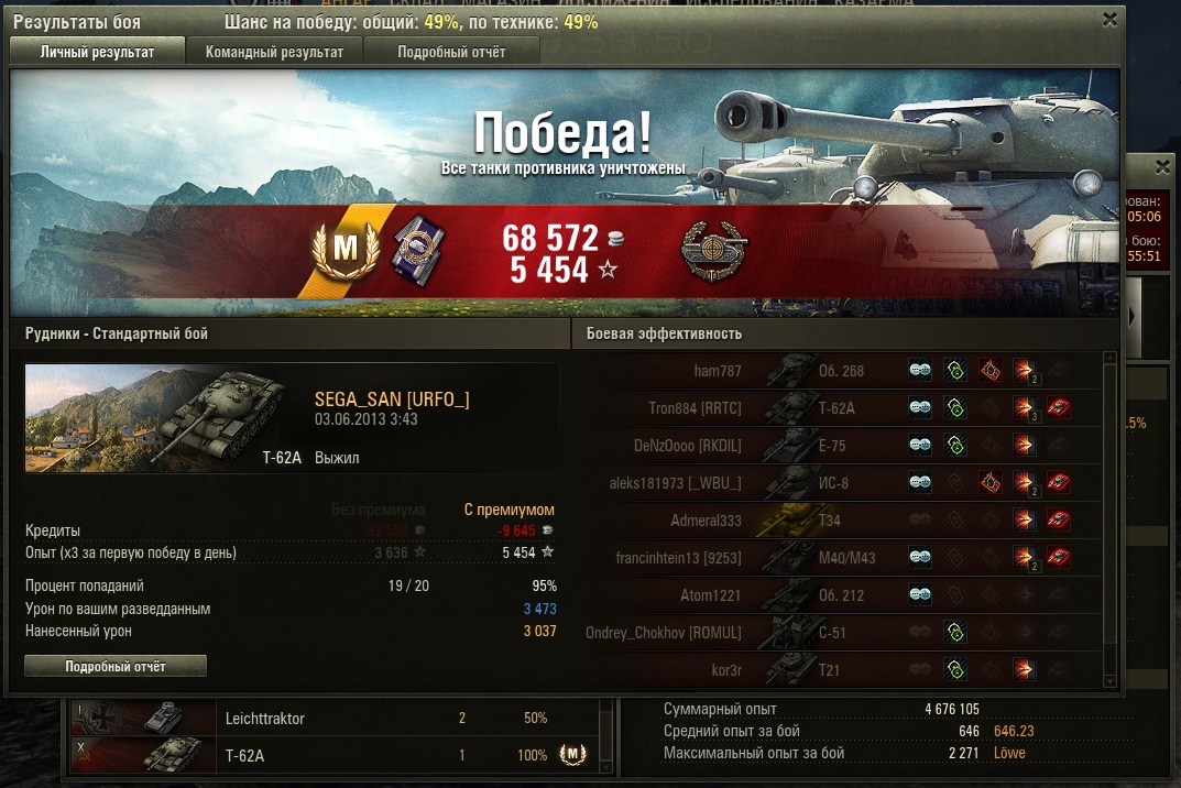 Очень нравится Т54, и вот наконец то вкачал и купил Т62_чку, да так обрадовался, что решив снять 3х в первом же бою мастера заколбасил, с первого же выстрела на ходу снёс 50-2, летевшую светить арту и потом понеслось... до самой до победы. Несмотря на то что многие говорят что 62_ка УГ, считаю что любая СТ в умелых руках (+мозг) способна выполнить свою роль и сделать вклад в командную игру для достижения победы.