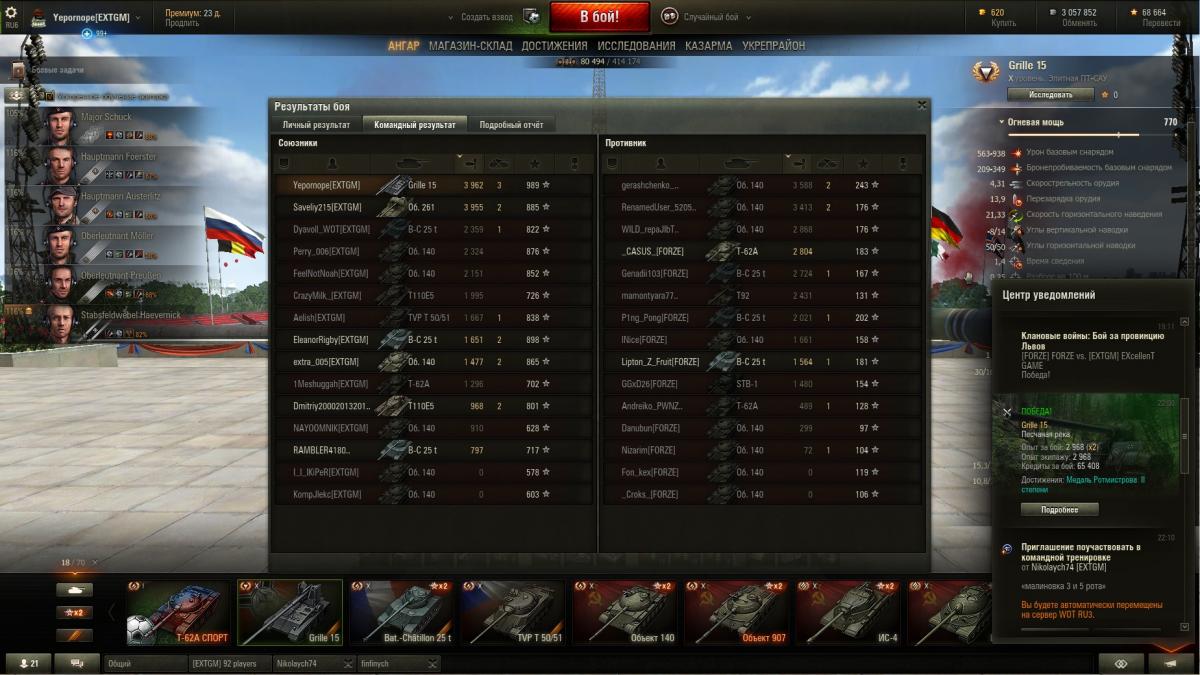 Всем привет. Я командир клана XGM - Yepornope. В прошлом полевой командир кланов НОРМ и EXTGM. В конце 2016 года ушел из танков. Сейчас активно играю и развиваюсь в качестве полевого. Ищу людей, которым нравится играть в вылазках на 10 лвл и наступлениях. Планирую собрать основную боевую роту клана в количестве 20 человек, чтобы были люди на замену или подстраховку. На данный момент есть 6 хороших бойцов с постоянным онлайном. Укрепрайон и фин.часть 10 уровня. Боевые выплаты включаем каждый день по 2 раза во время прайма. Требования для бойцов: 1) Общий % побед должен быть 54% и выше.( возможны исключения) 2) Последние сессии от 2200 wn8 на 10-ых лвл 3) Наличие ротной техники, хотя бы несколько машин из этого списка: ТТ: Об.277, Об.279(р), T95/FV4201 Chieftain, АМХ 50 В, Об.260. СТ: об.140, об.430у, об.907, Bat.-Châtillon 25 t. ПТ: Т110Е4, Т110Е3, Об.268/4, Foch B, Strv 103B, ЛТ: EBR 105, Т-100 ЛТ Так же наличие техники 8 и 6 уровней для вылазок и боев на гк. 4)Средний урон на технике 10-го уровня должен быть выше 2800 на *последних танках. (Возможны исключения) 5)Время прайма - 21.00 - 00.00 мск. Минимальный онлайн 4\7. Во время ивентов на гк требования к онлайну 7/7 6)Для связи используем TeamSpeak. Пишите мне в игре, или подавайте заявки в клан с пометкой "форум" *Последние танки - это те танки, на которых вы играли в последнее время.
