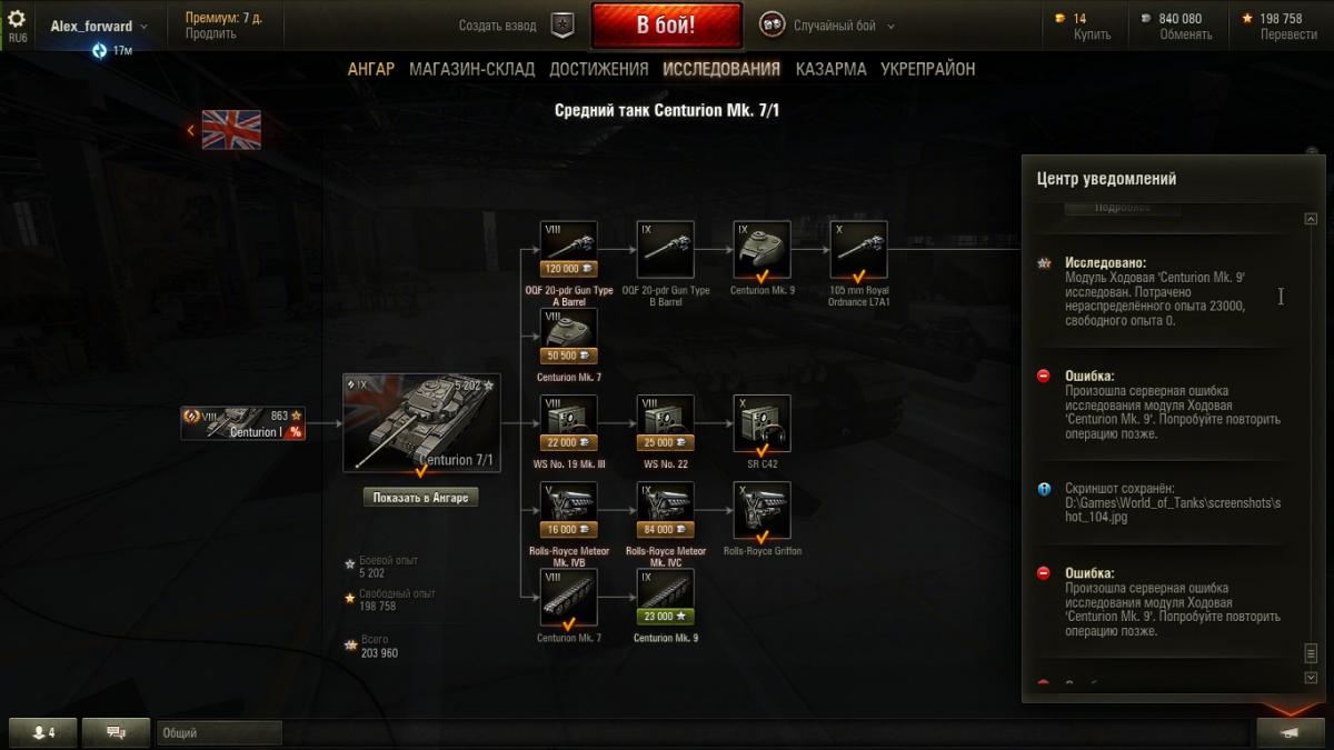 Накопил достаточно опыта (28 202 опыта) для исследования ходовой ст 9 уровня центуриона 7/1. При нажатии кнопки "исследовать" опыт в нужном объеме списался (23 000 опыта), однако модуль к покупке был неактивен. Подумал что баг, перезапустил игру, однако модуль теперь стал вновь не исследованым, а при попытке исследовать пишет следующее: Ошибка:Произошла серверная ошибка исследования модуля Ходовая 'Centurion Mk. 9'. Попробуйте повторить операцию позже. http://cdn-frm-eu.wargaming.net/wot/ru/uploads/monthly_09_2016/post-4455289-0-57681000-1473622120_thumb.jpg