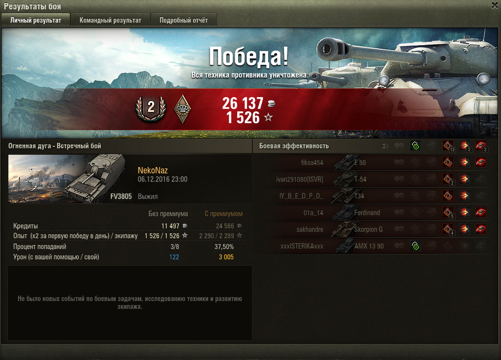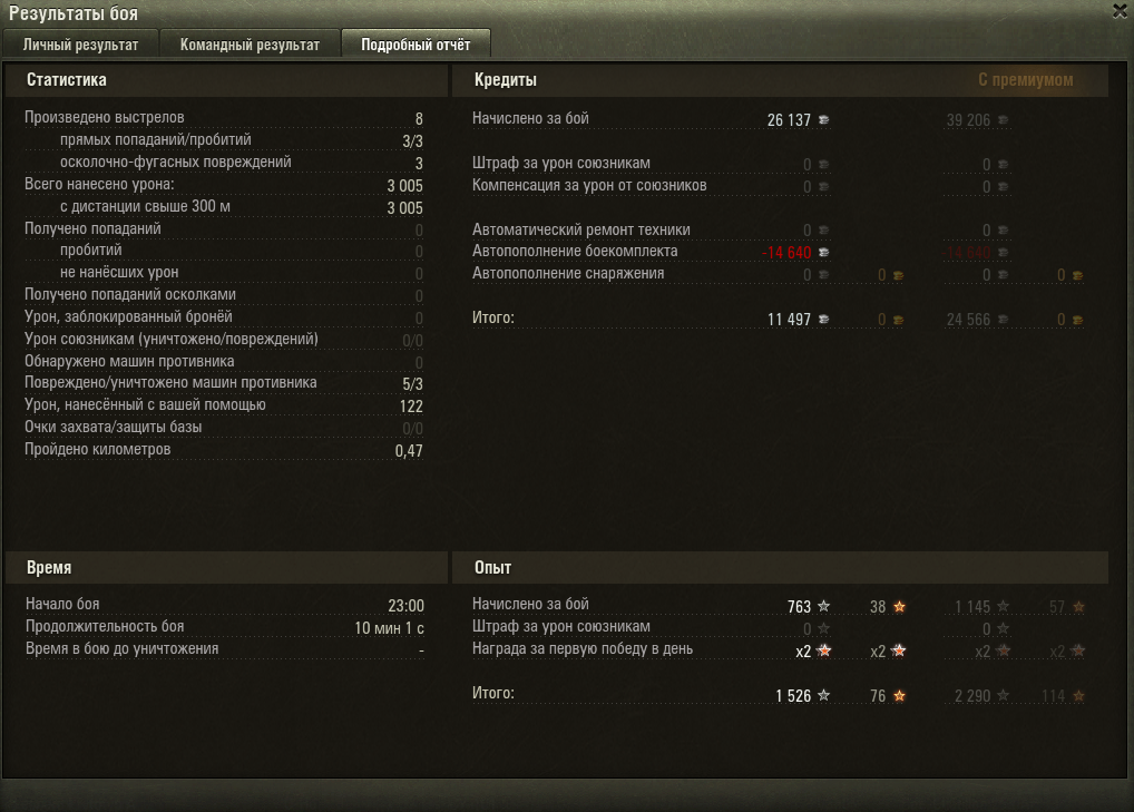 Попрошу вдумчиво отвечать на поставленный вопрос. Если я под конец боя перевернулся, дадут ли опыт, если я прожду до конца, но вокруг меня больше не будет никаких действий. Или по другому, есть ли штраф за выход из боя, если перевернулся? Забыл уточнить, что танк перевернулся на бок, то есть он не будет уничтожен. Почему я считаю прошлый ответ несоответствующим вопросу: Если покинуть бой, пока танк ещё жив, то опыт не дают вообще. Если покинуть бой, когда танк уничтожен, то никаких штрафов нет. Если покинуть бой, когда танк перевёрнут (на бок), то по результатам боя он выжил и есть опыт. Тут даже сложно сказать, произвёл ли мой танк засветы, пока лежал, а я вышел, но условимся, что этого нет. Т.е. ваш ответ совершенно неверный. Стоит отметить, что за выживание в бою начисляют опыт. Начисляют ли его в моём случае - это часть моего вопроса. В соответствие с информацией на https://ru.wargaming.net/support/kb/articles/38, в моём случае (выход из боя до его завершения при перевёрнутом на бок танке) по результатам боя должны дать такой же опыт, как и если танк просто дожил до конца боя (не забудьте про отсутствие действий и прочего). Так ли это или нет? Если нет, то почему?