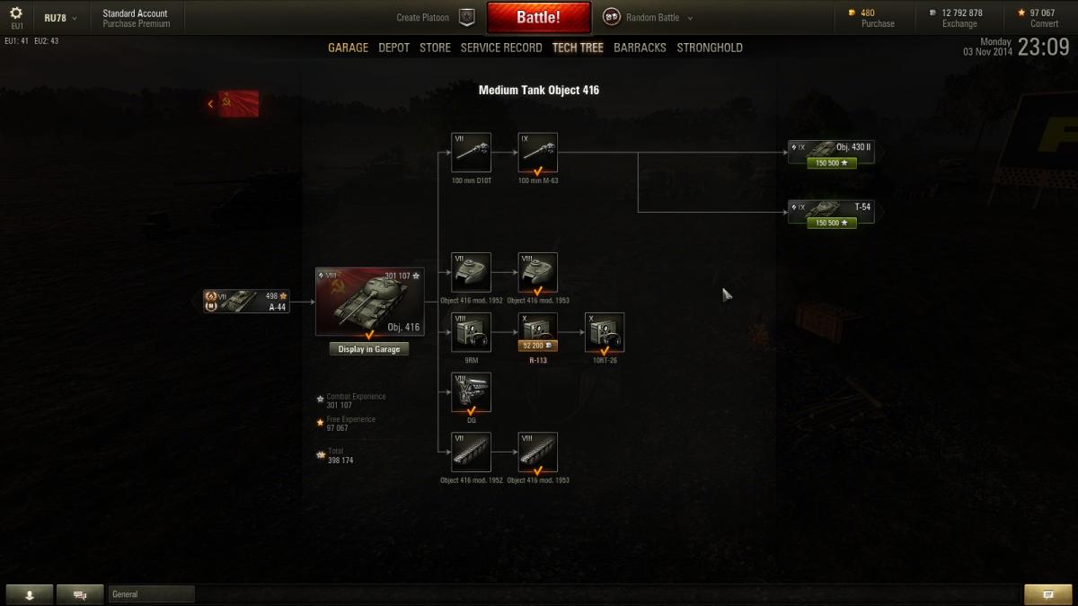 http://cdn-frm-eu.wargaming.net/wot/ru/uploads/monthly_11_2014/post-4566925-0-22271700-1415213738_thumb.jpg Вот оно, то самое чувство))) На выходных добил 416, в стоке кактус, полезность на уровне СТ 7лвл, после открытия пухи (примерно к 100 бою) всё наладилось. Первый "мастер" только в 200+ бою, всего их было 6 или 7, среднего урона около 1800. Расклад в боекомплекте был 29 бб/5 бк/1оф. ББ обычно хватает, а если нет, то и фиг с ним - према нет, голда акционная, так что отрицательную доходность пытался нивелировать руками, головой и кв-1 (сбиваю с него звезду каждую сессию). Танчик доставил, но от его хрупкости начал под конец уставать. Повезло с акцией на получение ТОГ-2, продал его сразу и вернул съеденные 416-м 700к серы. Пока буду ждать следующую акцию на 430-2, покатаю Т-44. Без него руки недопилены останутся, опять же ЛБ-1 и топ движку для 101 где ещё взять))) З.Ы. ИМХО народ избаловался - танки не гнут, серы нет, на стоке ездить не хочу. Не злоупотребляйте свободным опытом, от стока до топа сами, перепрыгивать через 2-3 танка не надо. Тогда не будет казаться, что более чем достойный об.416, к примеру, слабоват или вовсе неиграбелен. Всем успехов!