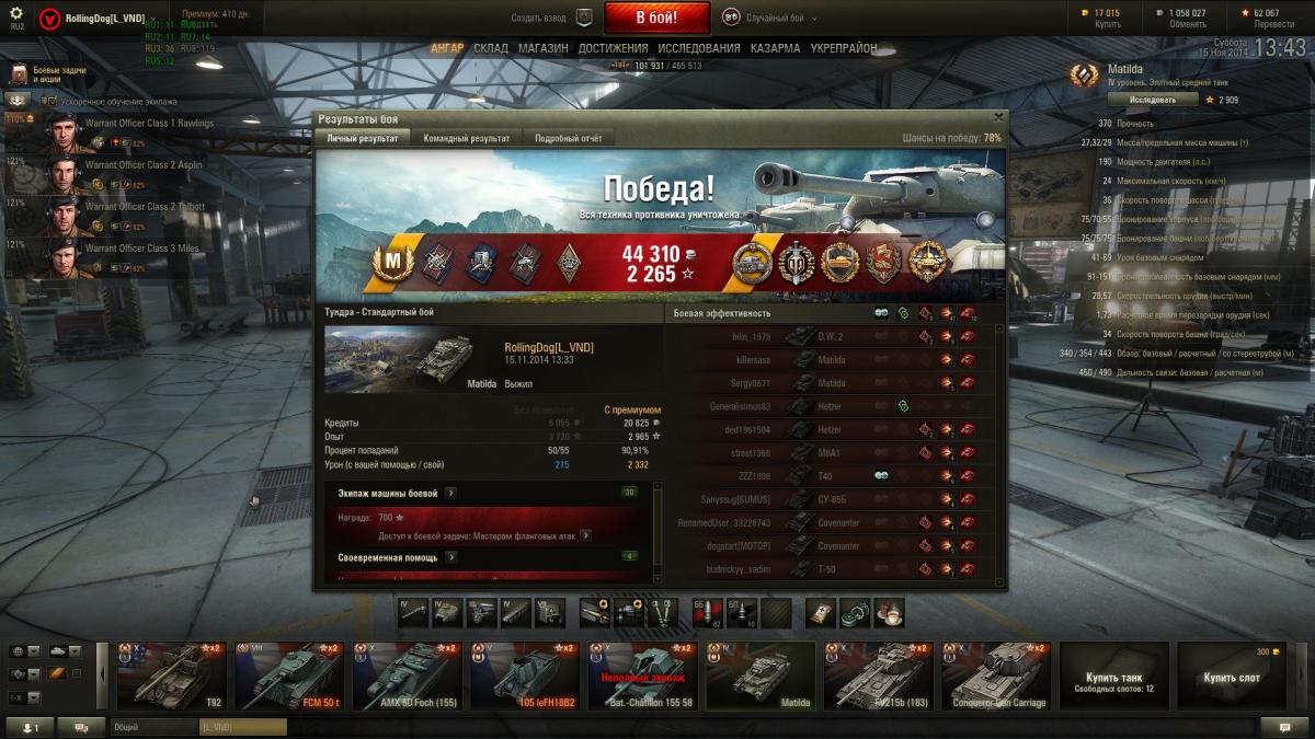 Самое сложное - контролировать ход боя, чтобы выбрать нужный момент для выхода. Первую половину боя приходится крысить с пт позиций, не теряя хп и ожидая, что враги останутся погрызенными настолько, что уйдут за 4-5 выстрелов, не успев понять, что происходит и пальнув раз-другой по нам без сводки - дзыньки по броне и сполохи красные на экране чаще, чем в 2 секунды этому способствуют, раки так вообще в панику впадают. Злые птшки врага проще всего забирать пока они отвлечены на кого-то ещё. Ни на одном танке я ещё не рассматривал команду как расходный материал/одноразовых светляков. Если осталось 5-6 погрызенных врагов вследствии того, что союзники дохли размеренно - бой наш. Если осталось больше, но баранов - то тоже наш. Если это 6ый левелы - остается лишь набить ещё чутка дамага/сбить захват/взять воина для эпической медали, которая даст нам опыт и серебро, как победителям. При этом, в боях с 6ми левелами часто вывожу рубль дамага, опережая при этом наголову топы. Тут уже даже за слив не обидно. Танк шикарен. С большой буквы. От этого вдвойне печально видеть других Матильд, сливающихся почти без дамага.