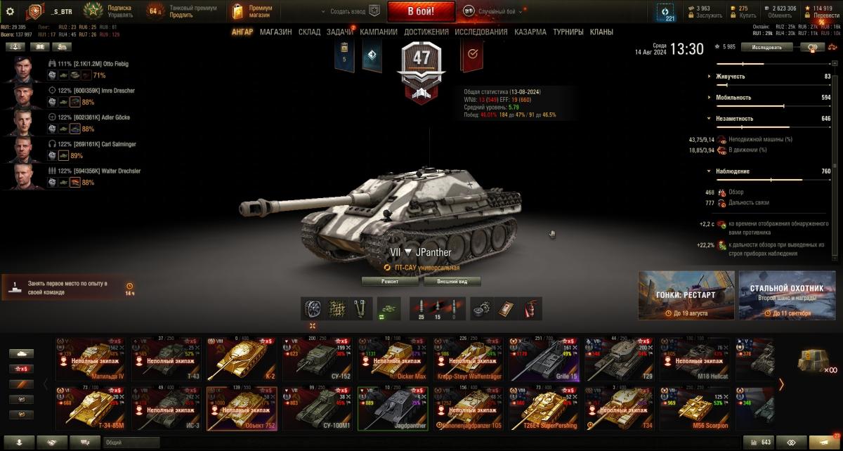 Всем добра ребята , вопрос вот возник - решил начать прокачивать на ягуЕ100 , отьездил на сковородке открыл Jagdpanther и там добавился радист , но экипаж уже накатан на премах и предыдущих машинах да и будет кататься на премах и навык командиру радиоперехват нужен , понимаю что он не работает на Jagdpanther да и фик с ним но возникла проблема - ставлю инструкцию маскировку для пущего усиления а оно не работает... точнее не пишет что что-то меняется сбоку в циферках , как было так и остается , на остальных инструкциях всё меняется , на машинах где командир без ошибки навыка тож всё работает Kanonenjagdpanzer 105 и Krupp-Steyr Waffenträger нормально а вот Jagdpanther и Dicker Max появляется свой радист и инструкция маскировки не работает.... или она работает но не отображается в параметрах... или оно не работает... или так и должно быть ???? подскажите кто разбирается плиз . З.Ы. глушитель работает только в движении или если машина стоит на месте тож маскировка усиливается ??? и вообще есть смысл задирать выше 63 стоя ???