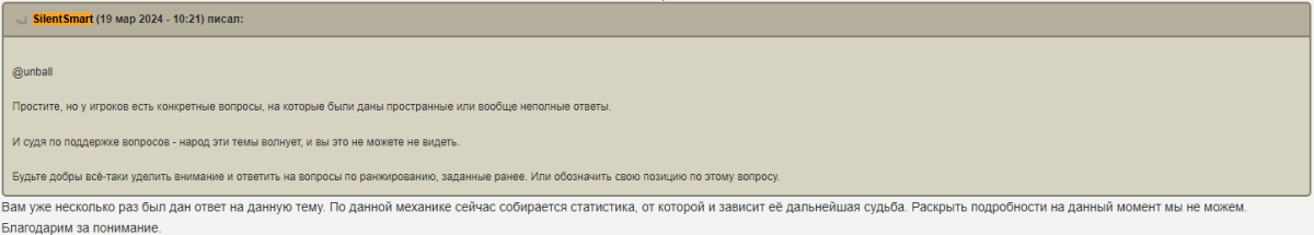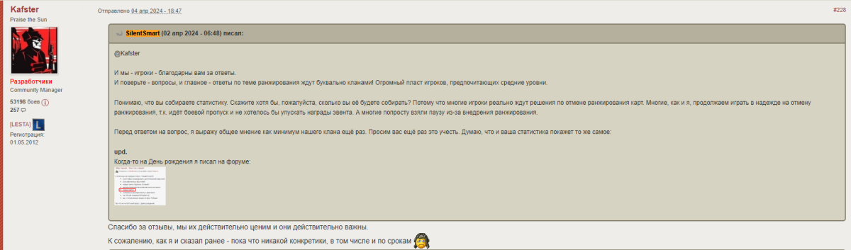 А вы мониторите обратную связь, и количество поддерживающих, например, вот это сообщение? http://forum.tanki.su/index.php?/topic/2201152-боевой-пропуск-«путь-к-победе»/page__st__60__pid__57437746#entry57437746 https://forum-mt-prod.lesta.ru/monthly_03_2025/post-45987-0-28449200-1741686491_thumb.png и других подобных сообщений? вы реально не понимаете как вы своими "доработками" к своей же ЦА отнеслись?