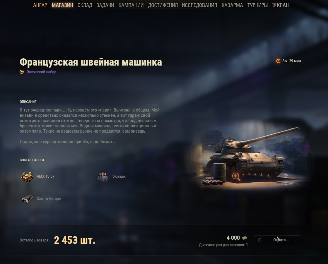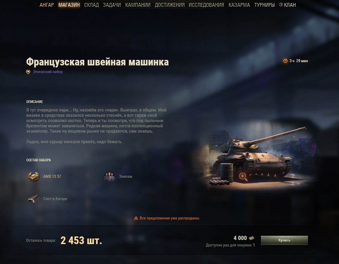 Доброе утро товарищи разработчики. Вчера, 20 ноября, в 19:00 стартовало очередное спецпредложение. В моём игровом клиенте отображался лот в виде доступа в клуб за 8000 бон. А на официальном сайте, по завершению продажи, - АМХ 13 57 за 4000 бон. Мечтал о этой машине. А получилось так, что из-за вашего косяка взять эту машину у меня не получилось. Всем хорошего дня, здоровья и настроения. Мира, добра, любви и семейного вам всем благополучия. Не ругайтесь и не обижайте друг друга. Жизнь слишком коротка, чтобы тратить на оскорбления и обиды такое драгоценное время как жизнь!