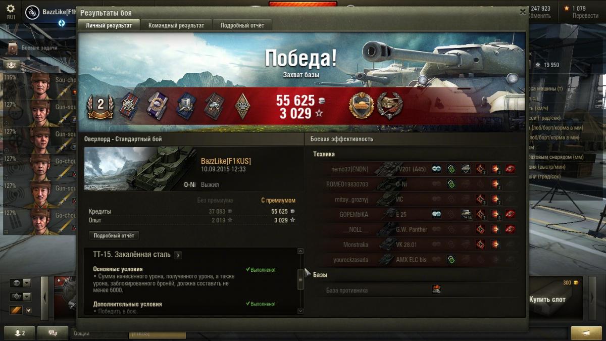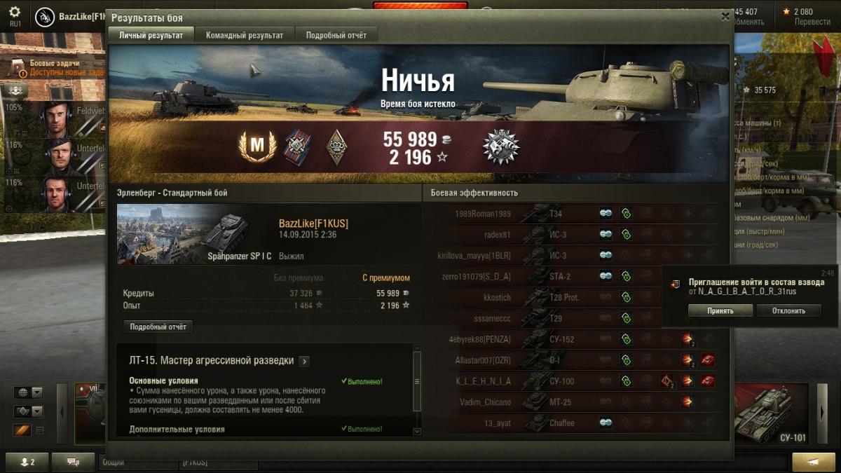 ПОтел потел...Все никак не мог выполнить с отличием лт-15 на штюга....То выполню, но умру....То пару боев 60 урона не хватило( все на шпике) И уже огорченный, решил скатать последний бой перед сном....и какой же он оказался потным...я уже догадывался , что насветил и надамажил на лбз( я без модов играю), и ей богу начал не высовываться и на 200 хп жить, светить аккуратненько( без лампы)...как итог ничья,убили последних врагов кроме одного( нас было трое).....ну и вот результаты, неймоверно рад выполнению...не из-за штюга, я его продал сразу...и из-за новых лбз, в которых смогу жестко фармитьhttp://cdn-frm-eu.wargaming.net/4.4/style_emoticons/wot/Smile_Default.gif Всем выполненных лбз!)