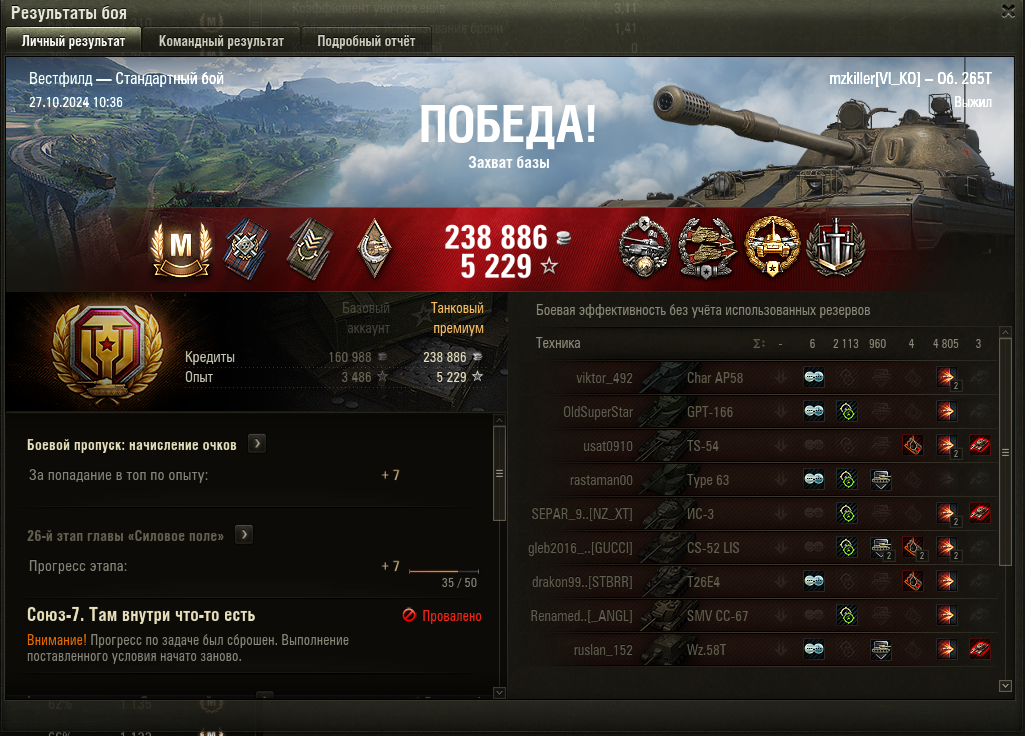Всем привет, вот и настало время, 3 отметки взяты, танк освоен. Оборудка - бон стаб, бон досыл, трофейная турбина т3, инструкция на досыл. Снаряды - 16 бопс, 5 бб ,1 оф. Модернизация только 4 и 5 - оба правые. Коротко по плюсам и минусам: + 1. Прекрасный урон, да максималку мы увидим не каждой тычкой, но она регулярно появляется на экране (гораздо чаще чем на 279). 2. К такому стволу нам дали условно нормальную броню, да есть лючки на башне, но их можно перекрыть пушкой + что-то от борта отбить. 3. К броне дали приличное количество ХП, как минимум любой размен будет в твою пользу. 4. УВН, хороший уровень комфорта игры - 8 позволяют играть на любом рельефе. 5. Урон по модулям, он отличный, криты летят часто. - 1. Габариты - ооо в этом слове прекрасно все, если вы не играли на Тайп5 хеви, вы застрянете на узких улочках Химок). У нас укрытия не рассчитаны на такую ширину машины, тебя везде видно. 2. Подвижность - сносная при определенных условиях, мы не гонка, но в целом успеваем в динамику боя, это позволяет реализовать бопсы, на хорошем уровне, однако на части карты у нас проблемы с тем что бы приехать к началу замеса. 3. Стаба и сведение, нужна оборудка, что-бы все это дело привести в чувство, игра вынуждает отказываться от закалки. 4. Криты - из-за пункта выше мы не можем себе позволить увеличить хп модулей. Сам горел редко, но бывает, что за бой по 2 раза баки выбивают в желтое, короче не очень приятно. Все остальные характеристики общие для 11 - хороший обзор, пропадающие в заборе бопсы, 2 гусля, все есть, сносная точность, нормальное кд и оно как у всех. Абилка - 2 стороны медали, иногда можно сделать весело 3 противникам за 20 секунд, но это скорее исключение. Нереально поджигает 5 точку, когда при абилке ты капаешь землю, просто минус мораль от такого. В остальном, если все правильно сделал, цифра урона в конце боя тебя порадует. При этом ее не надо держать до последнего, если чувствуешь, что надо дать тычку спокойно жмем ее. По результатам: На 3 отметки ушло - 215 боев. 3 дня сидел на отметке 94,5 - 94,9, пока не получилось подряд 3 нормальных боя. Мастеров, как обычно дают "Справедливо" - набил 10к, но фрагов нет, держи 1 степень)) Рекордный бой по урону - 12 921. Общие выводы и впечатления: Бзт брал 1 за орбиту, выглядит он конечно потрясающе, чисто Бейн блейд (во славу Императора). Под мой геймплей танк подошел, он позволяет на передке делать весело, да тебе также делают весело, но в основном ты всегда в плюсе. Нашу пушку реально боятся, из-за этого почти все бои ты навязываешь игру противнику и играешь 1 номером, точно так же как и на 279. Спецом не брал мбтб, т.к. там нужно потеть, что бы показывать результаты, от игры из-за этого устаешь еще больше, а тут можно расслабиться, и получать удовольствие, а уж как приятно его дарить другим, ну вы поняли короче. Бзт- 9 китайских миска рис из 10 сейчас в нашем рандоме. П.с. почему так криво работает балансировщик 11 тяжей понять невозможно. Кинуть 5 бзт против 5 279, ну где тут логика, неужели нельзя было их смешать. Из-за этого регулярно происходят казусы в виде боев со счетом 3-15, или 15-2. Где-то читал/смотрел, что 279 это контра Мбт-Б, который контра БЗТ, который в свою очередь контрит 279. Заявление спорное, по моим ощущениям он одинаково хорошо с ними справляется.