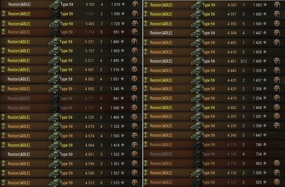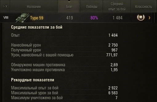 Порядок все с Type 59http://cdn-frm-eu.wargaming.net/4.3/style_emoticons/wot/Smile_blinky.gif, и броня, которой может похвастать не каждый средний танк, отдельно хочу отметить бронирование башни - основной козырь Type 59, т.к. башня у нас от непонерфленной Т-54, и мы имеем такую прекрасную башню на льготном СТ восьмого уровня, благодаря этому чугунному корыту можно делать то, на что не способны даже танки 9х уровней. Орудие достаточно хорошее - отличное пробитие базовым снарядом (181), и просто запредельным пробитием подкалиберным (241), этого пробития хватает, чтобы пробивать абсолютно все танки которые встречаются с нами в боях.Сведение слабовато, но не критично), динамика превосходная, по крайней мере ее хватает чтобы быстро занимать ключевые позиции на картах, и совершать переезды между флангами. Запредельной критуемости как таковой не замечал, хоть и катал с Доп. пайком), горел редко, бк периодически повреждали, но за 419 боев взрывали 1-2 раза, если учесть что экипаж прокачивался без перка "Бесконтактная боеукладка". Скриншот со статистикой танка, чтобы мои слова не казались безосновательными: Здесь приведена нарезка из топовых 40 боев с наибольшим уроном: Показатели фарма у танка тоже на высоте: Средние и общие показатели по фарму и опыту.В среднем: Кредиты Ремонт техники Снаряжение Опыт за бой без ПА 93 425 -5 263 -9 711 1017 Всего выстрелов за бой Пробитий %Попаданий Нанесенный урон Урон по разведданным 17 12 81% 2632 783 Уничтожено Повреждено танков Обнаружено Очки захвата Очки защиты 2 6,5 2,5 2 4 Итого: Кредиты Ремонт техники Снаряжение 25 878 872 -1 457 927 -2 690 000 В итоге могу сказать только то, что нам посчастливилось обладать одной из самых лучших и фановых машин в игре!http://cdn-frm-eu.wargaming.net/4.3/style_emoticons/wot/Smile_Default.gif
