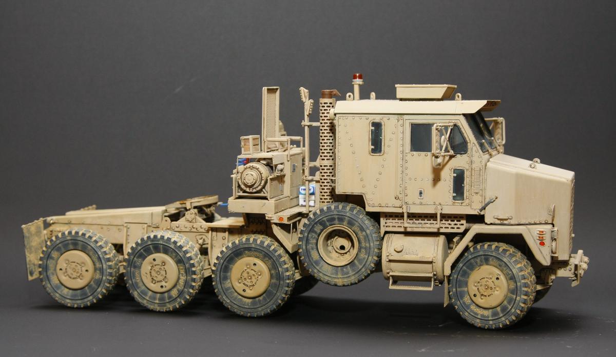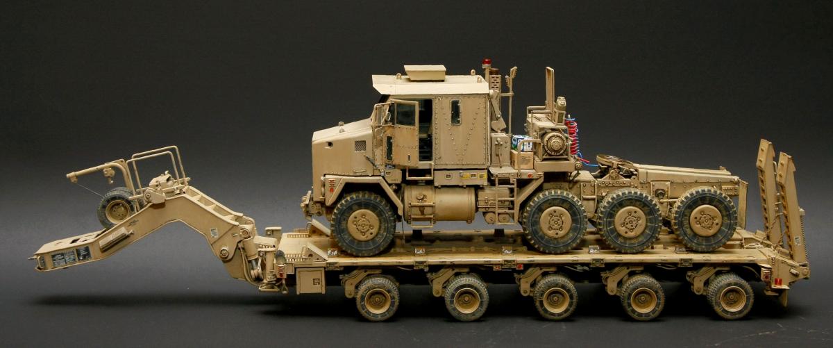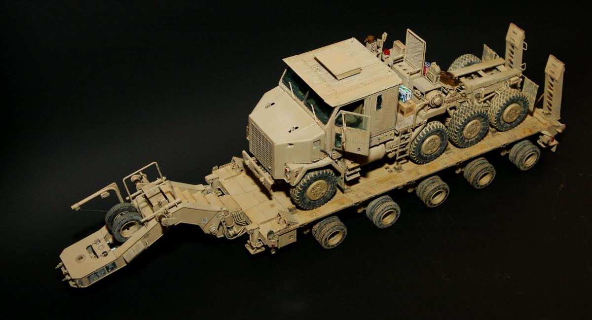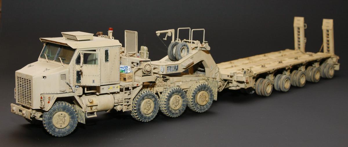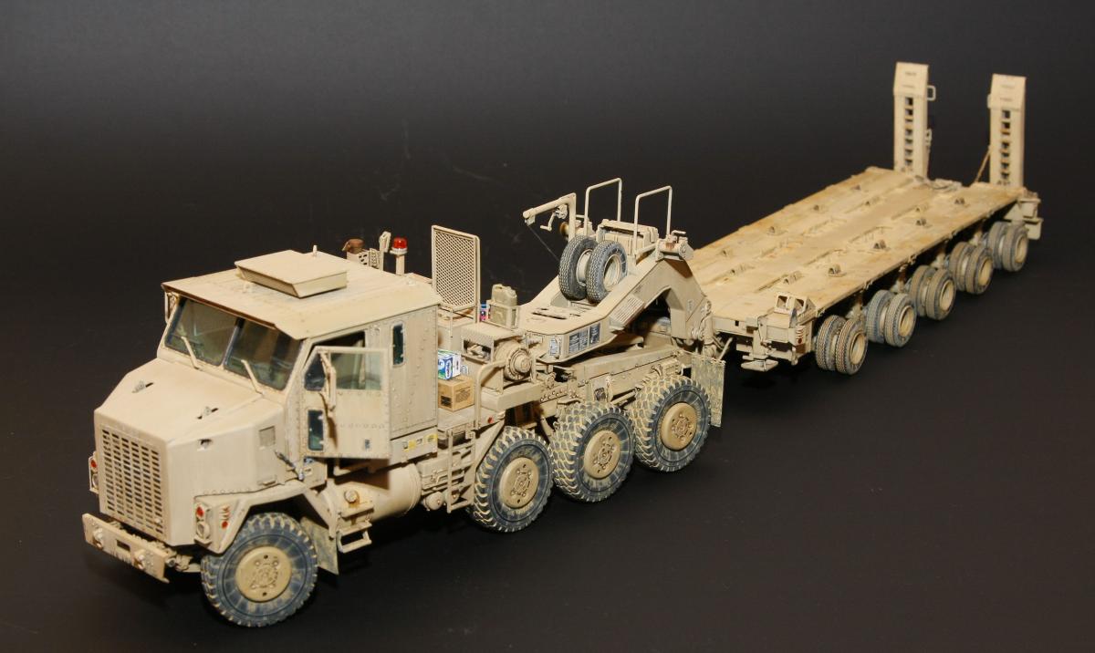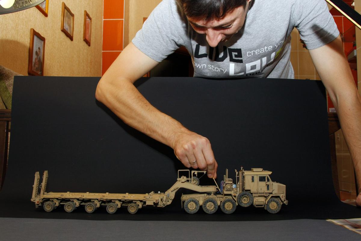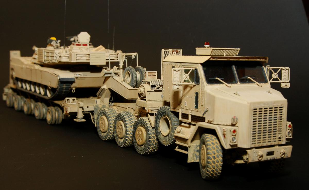 Коллеги, здравствуйте! Представляю Вам свою очередную работу-модель американского седельного тягача Oshkosh М1070 с прицепом-тяжеловозом М1000 HETS. Немного о прототипе: технические характеристики тягача и трейлера очень впечатляют, но их описание займет очень много места, поэтому просто дам ссылочку, кому интересно прочитают!http://bv.stroicar.com/equip.php?ID=689 По модели. Набор от именитой фирмы «HobbyBoss». В огромной коробке находится около 1500 пластиковых деталей, 11 плат фототравления, почти 5 метров мягкого провода для имитации гидравлики. Качество проработки деталей просто великолепное, множество деталей и механизмов после сборки остаются подвижными. http://www.super-hobby.ru/products/M1070-Truck-Tractor-and-M1000-HET-Semi-trailer.html Сборка и окраска. Если кратко, то модель очень интересная в сборке но скажем так не для новичка. Во первых на тягаче очень много выступающих деталей, как пластиковых так и из фототравления, это требует большой аккуратности при работе с моделью. Трал- изобилует массой повторяющихся деталей, по крайней мере меня это довольно сильно напрягало, сборка 40 колес, затем их сборка в 10 теле, затем проводка гидравлики к этим 10 телегам! Ну и конечно, еще на этапе сборки необходимо сразу продумывать этапы окраски, разбить модель на основные узлы, где то наложить маски, что то пока не склеивать в общем напрягать мозг!)) Красил краской TamiyaXF-78 woodendecktan. Фильтра пигменты в основном MIG. Приятного просмотра!