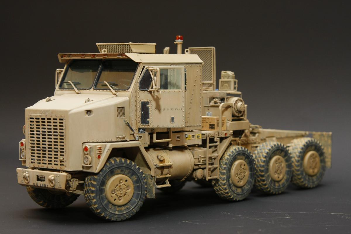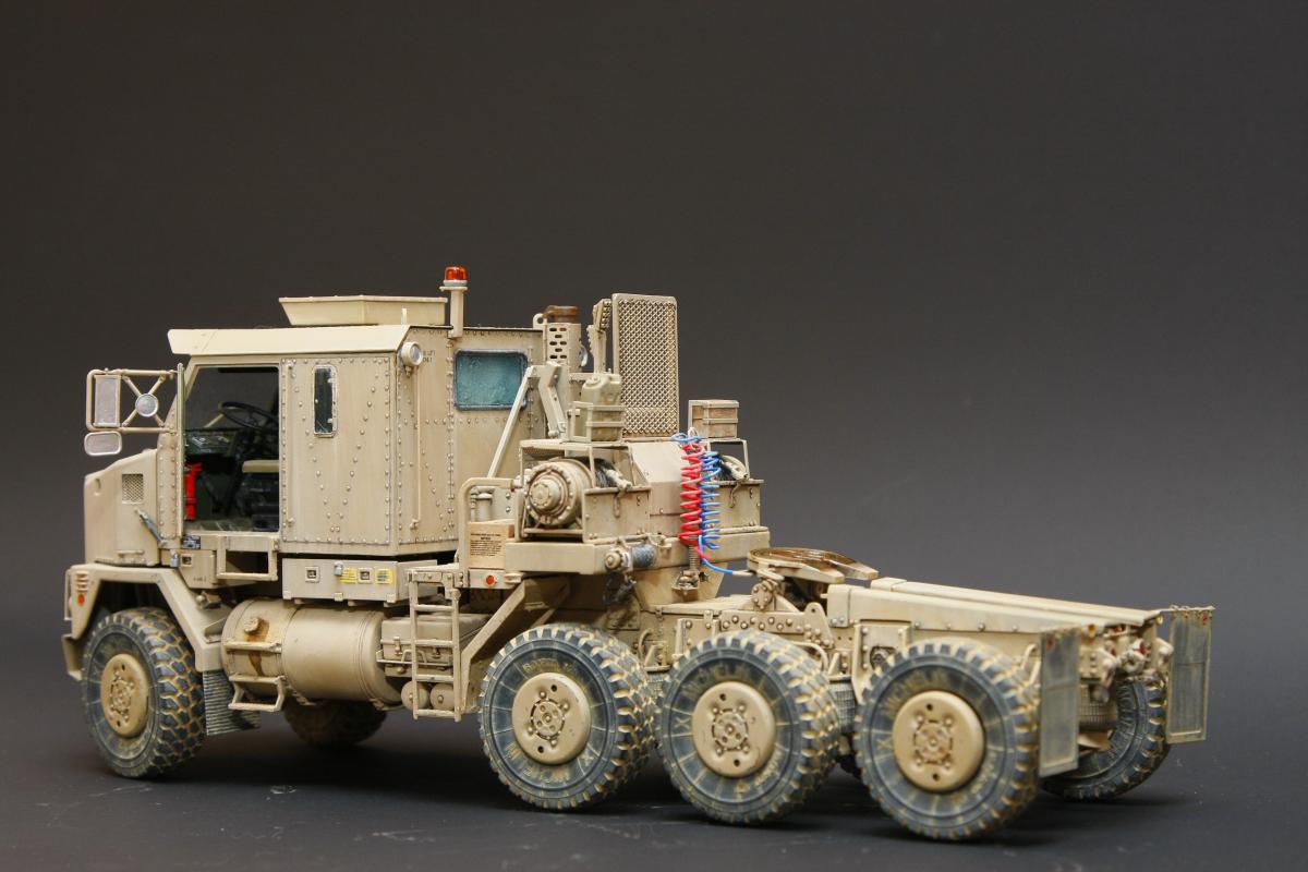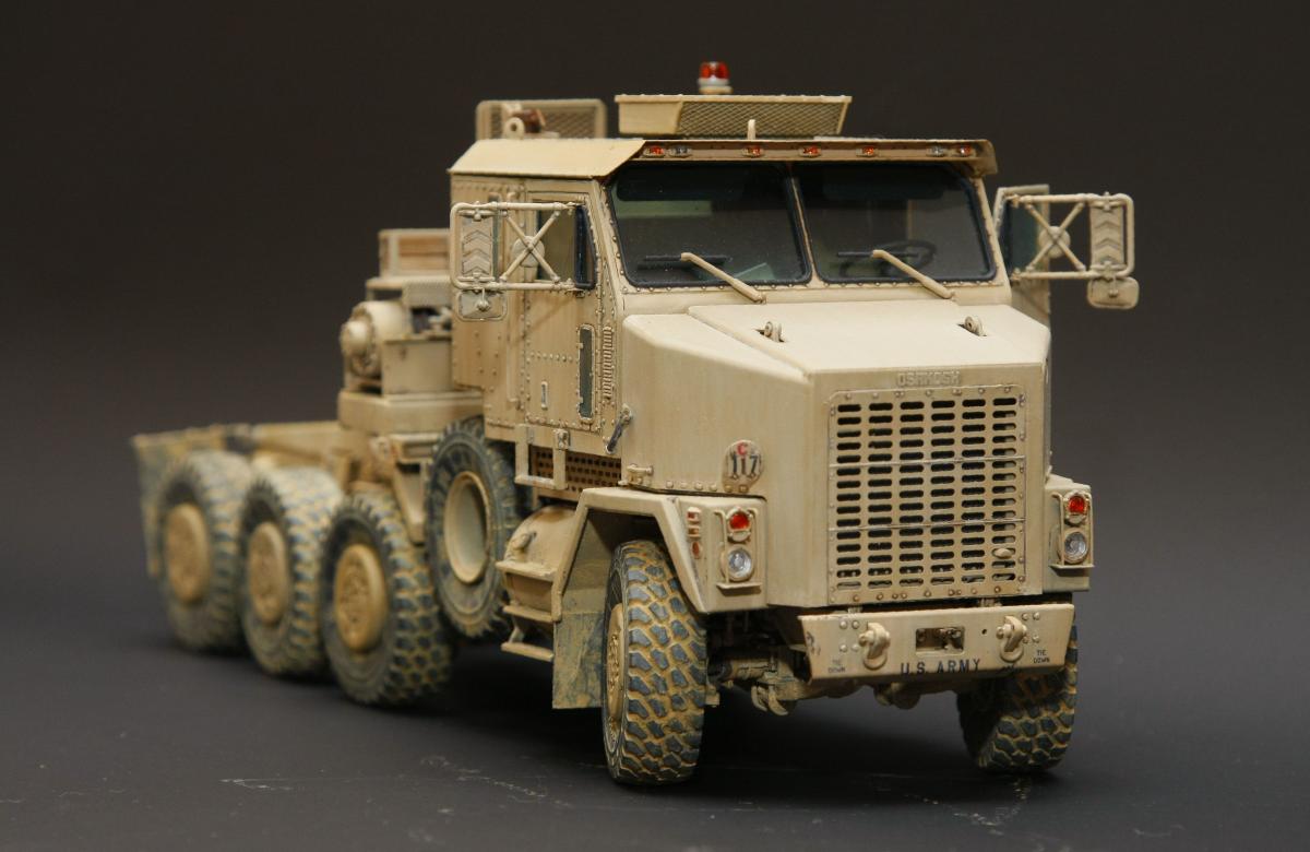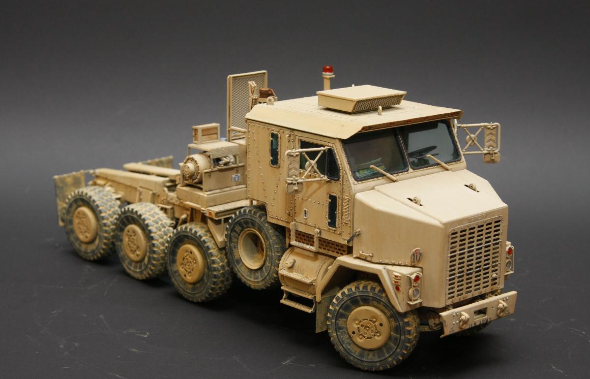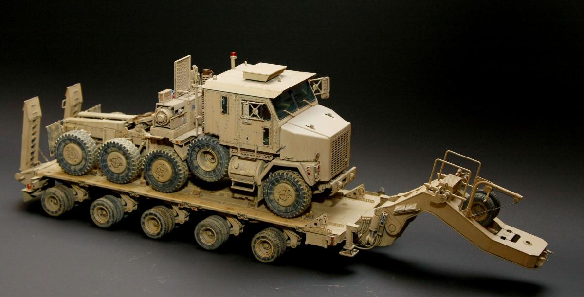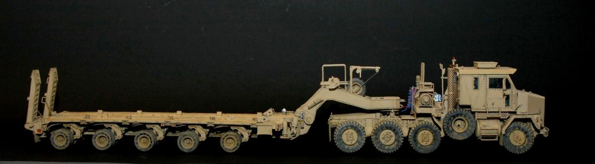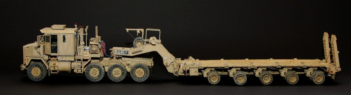 Коллеги, здравствуйте! Представляю Вам свою очередную работу-модель американского седельного тягача Oshkosh М1070 с прицепом-тяжеловозом М1000 HETS. Немного о прототипе: технические характеристики тягача и трейлера очень впечатляют, но их описание займет очень много места, поэтому просто дам ссылочку, кому интересно прочитают!http://bv.stroicar.com/equip.php?ID=689 По модели. Набор от именитой фирмы «HobbyBoss». В огромной коробке находится около 1500 пластиковых деталей, 11 плат фототравления, почти 5 метров мягкого провода для имитации гидравлики. Качество проработки деталей просто великолепное, множество деталей и механизмов после сборки остаются подвижными. http://www.super-hobby.ru/products/M1070-Truck-Tractor-and-M1000-HET-Semi-trailer.html Сборка и окраска. Если кратко, то модель очень интересная в сборке но скажем так не для новичка. Во первых на тягаче очень много выступающих деталей, как пластиковых так и из фототравления, это требует большой аккуратности при работе с моделью. Трал- изобилует массой повторяющихся деталей, по крайней мере меня это довольно сильно напрягало, сборка 40 колес, затем их сборка в 10 теле, затем проводка гидравлики к этим 10 телегам! Ну и конечно, еще на этапе сборки необходимо сразу продумывать этапы окраски, разбить модель на основные узлы, где то наложить маски, что то пока не склеивать в общем напрягать мозг!)) Красил краской TamiyaXF-78 woodendecktan. Фильтра пигменты в основном MIG. Приятного просмотра!