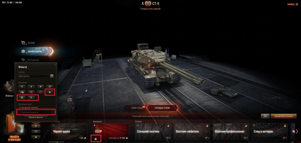 Добрый день, товарищи. Представляю вашему вниманию мод Extra Style Filters - Дополнительные фильтры стилей. Данный мод дополняет фильтры стилей следующими фильтрами: по названию стиля, стили, которые можно продать, стили, которые подходят только к текущему танку. Также мод позволяет снимать стили с других танков, через контекстное меню. Скачать мод можно по этой ссылке или по этой. Скопировать скачанный файл по пути: папка с установленной игрой\mods\актуальная версия игры\