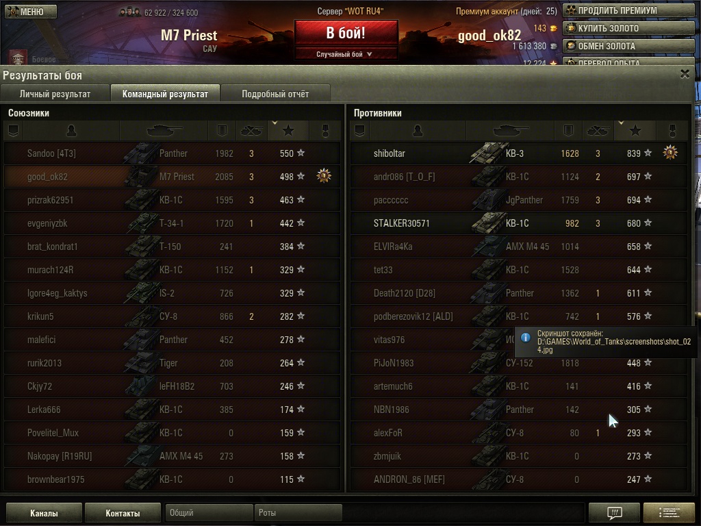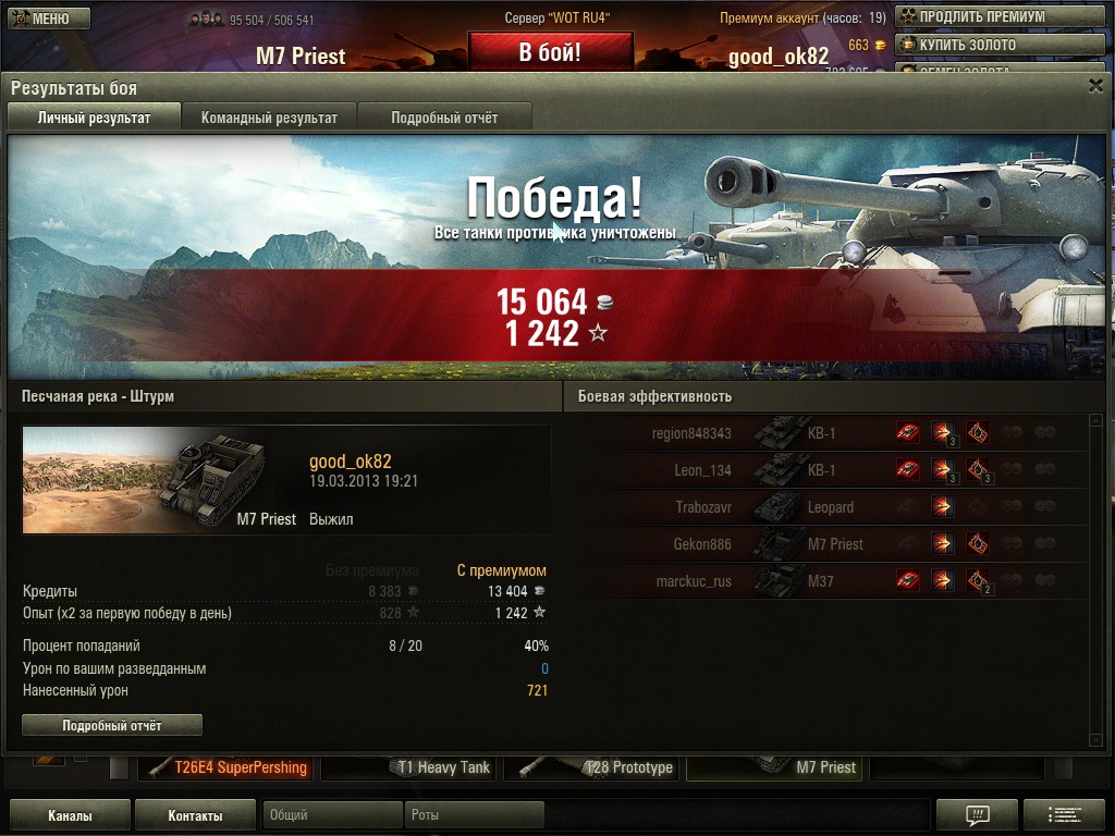 А вот пример, когда в топе 5-й уровень! Ситуация гораздо лучше, хотя бой прошел хуже, чем с вариантом с топами 8-го уровня: процент попаданий, да и количество самих попаданий меньше, но урона больше и даже уничтоженные танки есть!!! Вывод: надо ограничить максимальный уровень соперников M7 Priest до 6-го уровня. Но так как это вряд ли будет сделано, то надо просто перетерпеть... Что я и делаю. P.S. Голду не покупал и не буду покупать ни за серебро, ни за золото из принципа!:)