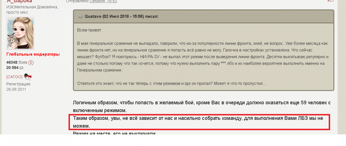К примеру, у меня орудие заряжалось 1,9 секунд, а стало 2,0 секунд. Убрали доли секунд. Немного исправил: К примеру, у меня орудие заряжалось 1,99 секунд, а стало 2,0 секунд. Убрали сотые доли секунд. Зачем? Можете ссылку дать на этот вопрос и чем аргументировали подобное решение. Особо умным - в спорте даже доли секунда определяют кто будет первым, а кто вторым. Танки не киберспорт? Чего тогда есть жалоба "неспортивное поведение"?