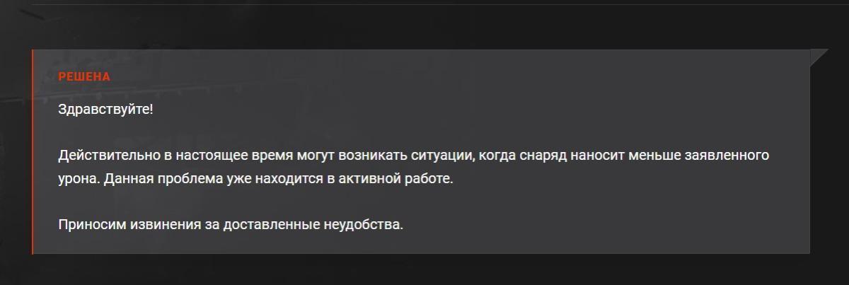 Там буквально написано : "Действительно в настоящее время могут возникать ситуации, когда снаряд наносит меньше заявленного урона. Данная проблема уже находится в активной работе. " Вы можете толковать это как угодно, но "могут возникать ситуации, когда снаряд наносит меньше заявленного урона" попадает под определение ошибки или бага.