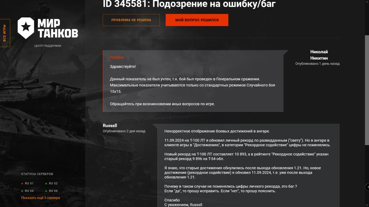 Вопрос к разработчикам, можно узнать, по какой причине в Достижениях (в клиенте игры), не учитываются бои в режиме "Генеральное сражение".? 11.09.2024 на Т-100 ЛТ я обновил личный рекорд по разведданным (свету). Но в ангаре в клиенте игры в "Достижениях", в категории "Рекордное содействие" цифры не поменялись. Я создал заявку в центр поддержки, и получил ответ.. цитирую ответ службы поддержки: "Данный показатель не был учтен, т.к. бой был проведен в Генеральном сражении. Максимальные показатели учитываются только со стандартных режимов Случайного боя 15х15." и ещё вопрос, Почему нигде не написано что "Достижения" учитываются только в "стандартных режимов случайных боёв" и не учитывается в генеральном сражении.? *во всяком случаи я не нашёл данной информации ни на сайте, ни в игре.. https://forum-mt-prod.lesta.ru/monthly_09_2024/post-4813762-0-46229200-1726347204_thumb.jpg https://forum-mt-prod.lesta.ru/monthly_09_2024/post-4813762-0-39649500-1726347235_thumb.jpg https://forum-mt-prod.lesta.ru/monthly_09_2024/post-4813762-0-39129600-1726347410_thumb.jpg https://forum-mt-prod.lesta.ru/monthly_09_2024/post-4813762-0-22723200-1726347282_thumb.jpg