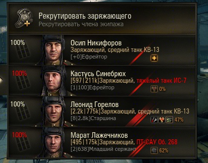 Приветствую Вас господа танкисты.. Играю с конца октября,поэтому пока нуб во многих вопросах . Есть пара вопросов. Часто выполняя ЛБЗ ,видел что в награду предоставляется день аренды того или иного танка. На памяти ИС-7 и ПТ САУ ОБ.268 Пытался искать их в ангаре, магазине. Не нашёл. Думаю значит что то не выполнил или не понял.. Вчера взял КВ-13 ,без экипажа,решив пересадить на него экипаж с Т-34-85. И при выборе экипажа предлагались члены экипажей с ИС-7 и ПТ САУ ОБ.268 которые я и в глаза не видел.. Скрин прилагаю. .Танки эти ни коим глазом не видел,а значит не воевал на них. Тогда почему к примеру, умения у заряжающего ПТ САУ ОБ.268 имеют 68%? И поясните мне,где искать в будущем награду в виде танков на день аренды??
