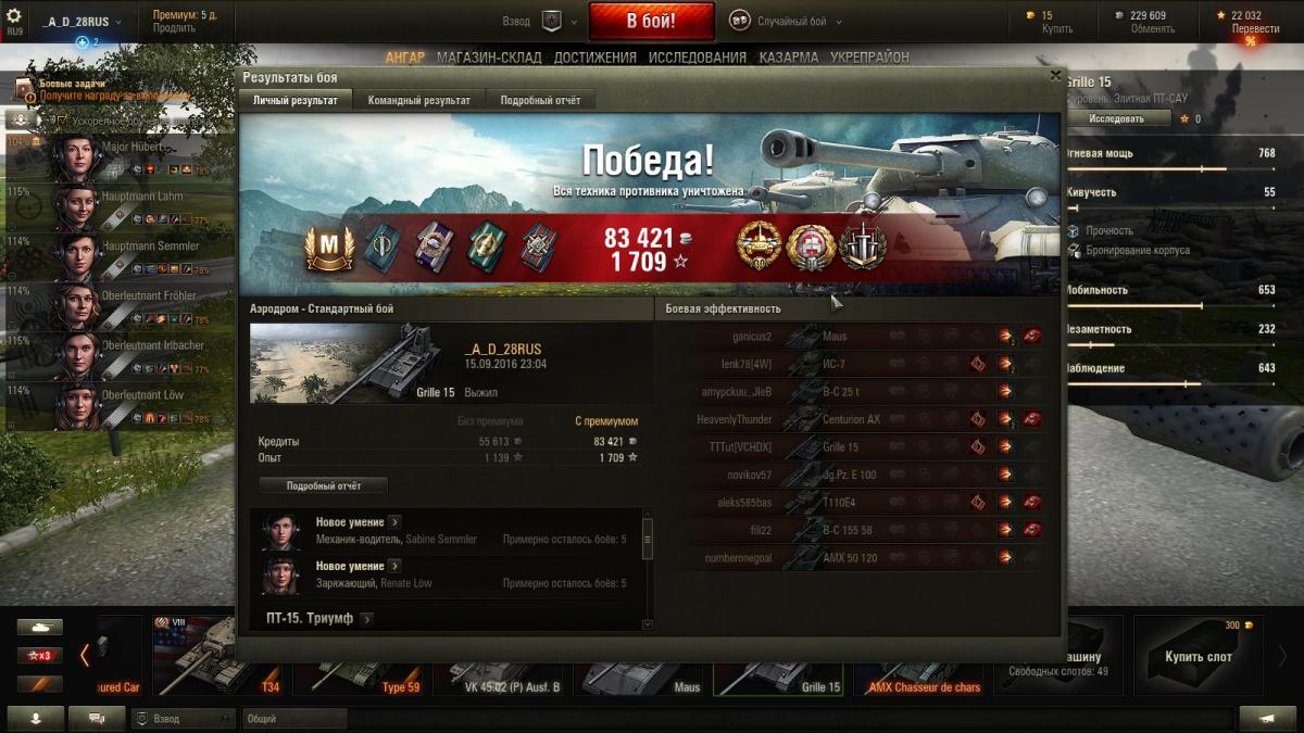 15 сентября купил гриля для ЛБЗ 15 поиграл немного вечером , даже экипаж до топа не прокачал , а поздно вечером сынуля попросил на гриле погонять--ну пж-ста сына--ЕДЬ , через часа два приходит --подарок тебе - говорит ))) -- смотрю --гриль-" Аэродром " 8552 и 4 фрага --сделал без отличия -вот так 15-тая вошла ).