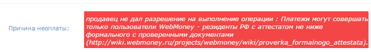Ребята помогите пожалуйста решить проблему. Хочу купить себе AMX CDC, через премиум магазин. На кошельке данная сумма имеется, при покупке а точнее после подтверждения смс, появляется окно с причиной неоплаты, цитирую: продавец не дал разрешение на выполнение операции: Платежи могут совершать только пользователи WebMoney - резиденты РФ с аттестатом не ниже формального с проверенными документами. Посмотрел свой аттестат он формальный! Все документы есть, копия паспорта и т.д. В чем тогда дело? Помогите пожалуйста буду очень благодарен. (И ещё просьба модераторам перенести тему в нужный раздел, просто не нашел куда написать данную проблему)