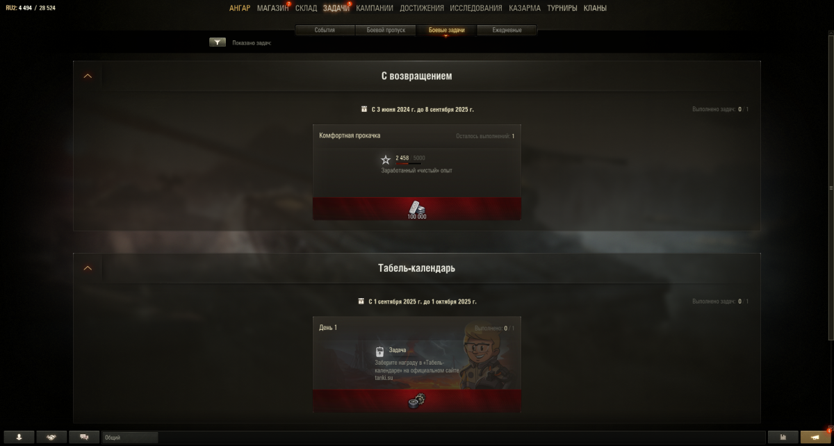 Зашел глянуть обнову. Прилетел бонус на возврат, 1 прем день и боевая задачка на 100к. Глянул условия, а там уже выполнено 2458 из 5000 заработанного "чистого" опыта. Вопрос по игре, как можно набрать 2458 свободного опыта не играя в игру? Последний раз играл 24 августа. Или она у вас накопительная и не сбрасывается с прошлых таких задач на возврат, если не была выполнена ранее, т.к. время проведения с 3 июня 2024 по 8 сентября 2025?