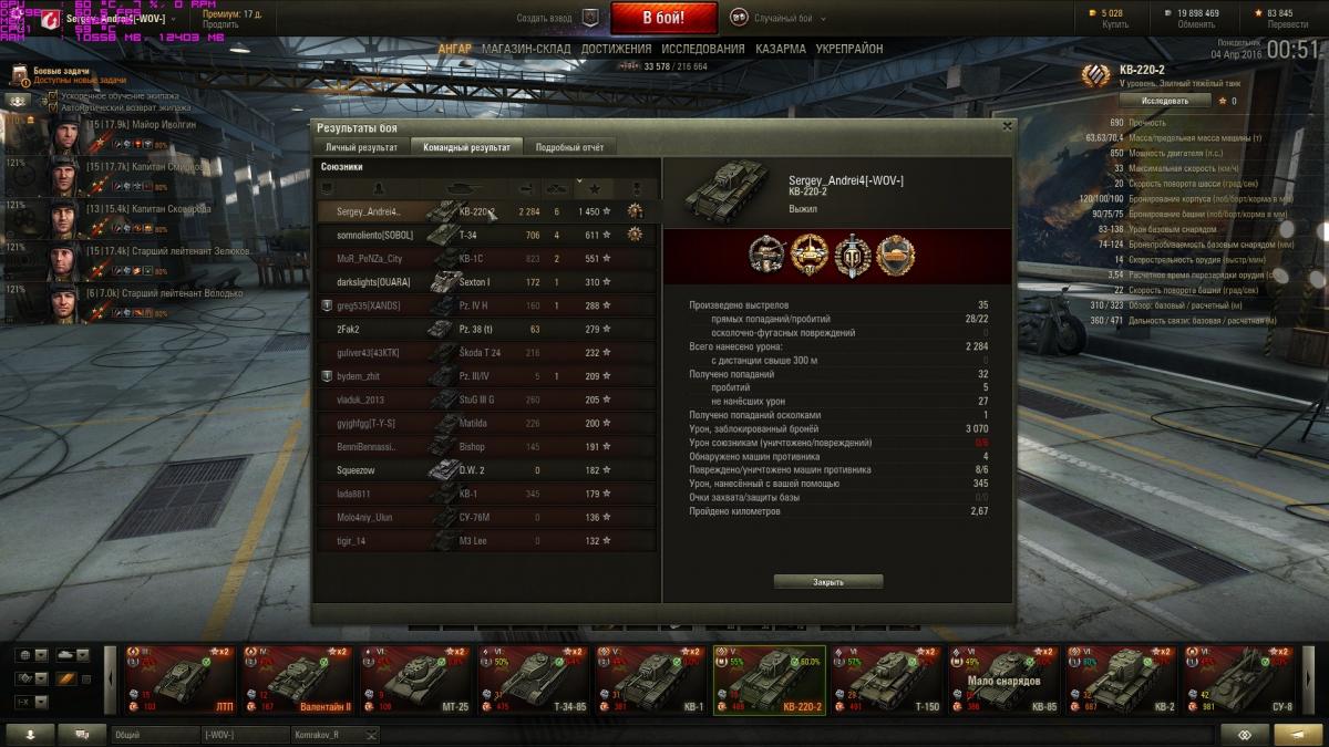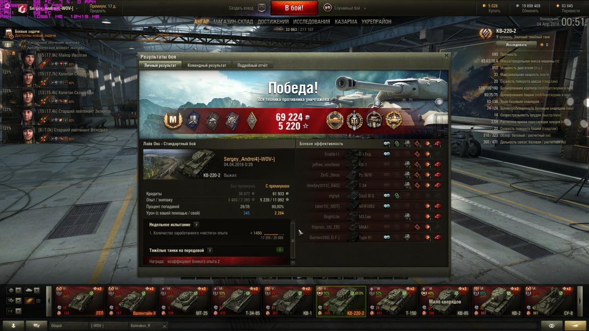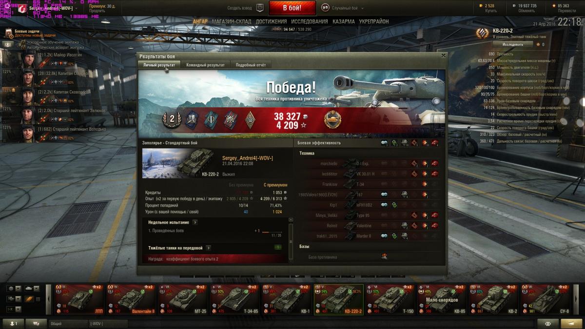 Что-то вас 220 очень сильно обидел я смотрю, но это не повод чтобы наговаривать на вполне приятный танк. У меня конечно не такой опыт как у вас, но для меня, нуба, этот танк является самым ходовым, кроме него вообще ни на чем не играю. Вполне себе подтверждаю, что слова alexlarry что в большинстве случаев танк кидает в топ и середину, процентов 20-30% в низ списка. Да, когда находишься внизу списка играть очень тяжело, но если бы еще и внизу списка было легко и интересно, то этот танк был бы совершенно несбалансированным и его в любом случае понерфили бы. Я тут где-то уже приводил "среднюю" статистику по моим наблюдениям попаданий, и когда танк внизу списка, он все равно в среднем выдерживает от 4-5 попаданий, включая рикошеты или непробития от O-I, так что можно и с 6ми уровнями делов наделать. Как вам посоветовали, пересмотрите свою игру на этом танке, вероятно вы действительно делаете что-то не так. Я долго боялся O-I, но когда один раз сделал как написано в гайде, т.е. посадил на каток, получил от него выстрел, и пока он перезаряжался заехал к нему вплотную в борт и тупо расстрелял, я понял, что ничего в нем "этакого" нет, но само собой стараюсь избегать встречи с ним, если это возможно. АТ2 так же бесит меня до трясучки, но если не стоять и не тупить ей в лоб, а постараться обойти, то и она раскалывается. Dober_57 Вроде как только за вибронакидку можно получить на данный момент этот танк. Но скажу так, хоть танк и прикольный, тратиться сам на вибронакидку я бы не стал, пережил бы наверное, но т.к. друзья подарили в далеком году, когда она стоила еще относительно недорого, то я этому очень рад. А так наверное будут какие-то акции на которых можно будет получить данный танк, в данной теме скорее всего может быть будет это освещаться.