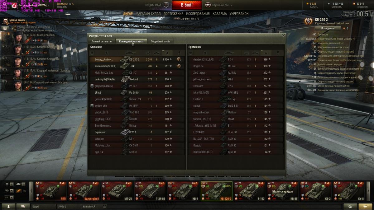 Прошу прощения за оффтоп, но раз уж к слову пришлось объясните, если не сложно. Сразу обращу внимание, что катаюсь только на розетке, т.к. на других не так интересно)) Цели всех нагибать нет, просто в удовольствие играю. У меня сейчас есть 5 советских ТТ: 1) КВ-1. Полностью исследован,у экипажа 85% изучено ремонта. Ускоренное обучение. 2) КВ 220. Ускоренное обучение. Ремонт и боевое братство полностью, еще один скилл 100% и 4тый сейчас 77% 3) Т-150. Не исследован только КВ-3 до ускоренного обучения, да и пока нет желания, т.к. катаюсь только на розетке)) 4) КВ-85. Не исследованы КВ-13 и ИС, ситуация с исследованием такая же, как и с Т-150. 5) КВ-2. Полностью исследован, у экипажа 95% ремонта. Ускоренное обучение. У первых трех состав экипажа идентичен. У КВ-85 нет радиста, у КВ-2 наоборот дополнительный заряжающий. Правильно ли я понимаю, что я могу уволить экипажи всех этих танков, кроме экипажа розетки, и его пересаживать между всеми 5тью танками? Соответственно на 85 не будет задействован связист, а на КВ-2 будет медленнее качаться второй заряжающий, так? Спасибо заранее.