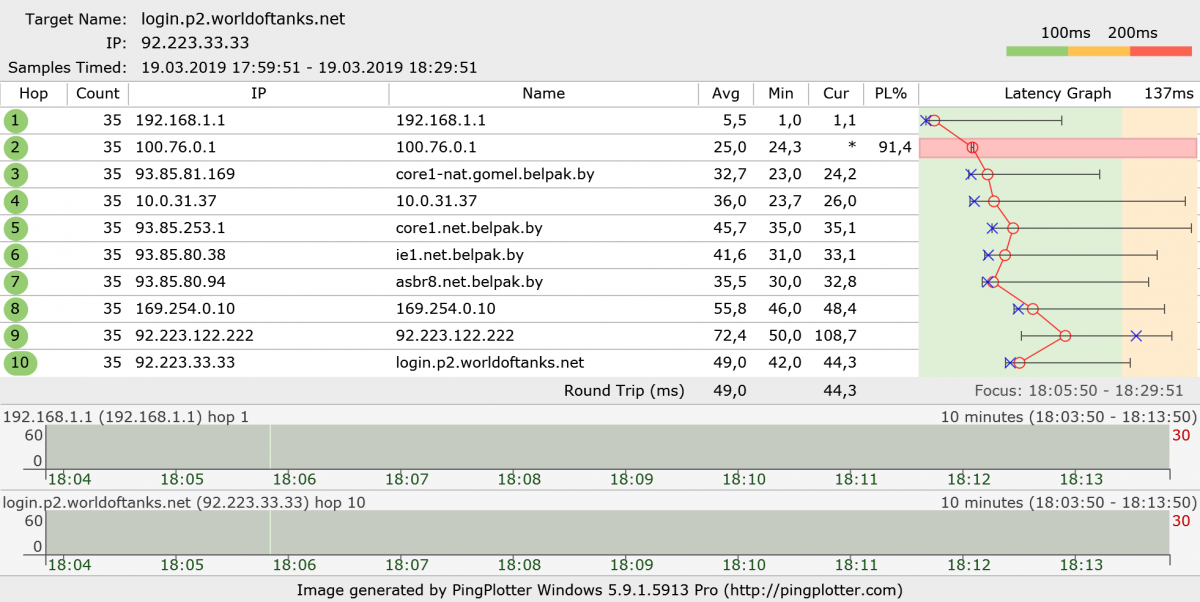 http://cdn-frm-eu.wargaming.net/4.5/style_images/wg/snapback.pngZloyBut (20 Мар 2019 - 17:38) писал: У вас в отчете Пингплоттера КАРТИНКА в формате png, а не pp2 файл! Зачем вы изменили расширение файла перед упаковкой? 8-) Сделайте все таки еще тест и сохраните отчет в нормальном формате Пингплоттера - pp2. Судя по картинке - у вас огромные потери пакетов на втором узле 90% - это скорее всего ваш домашний оптический медиаконвертер. Либо это ближайший к вам концентратор провайдера - например подъездный. Опишите подробнее - какое оборудование для Интернета установлено у вас дома (точные модели) и как оно соединено между собой. Там pp2 файл, я живу в деревне.