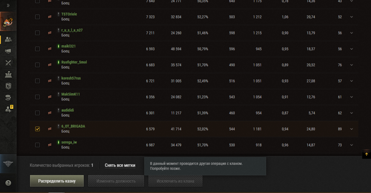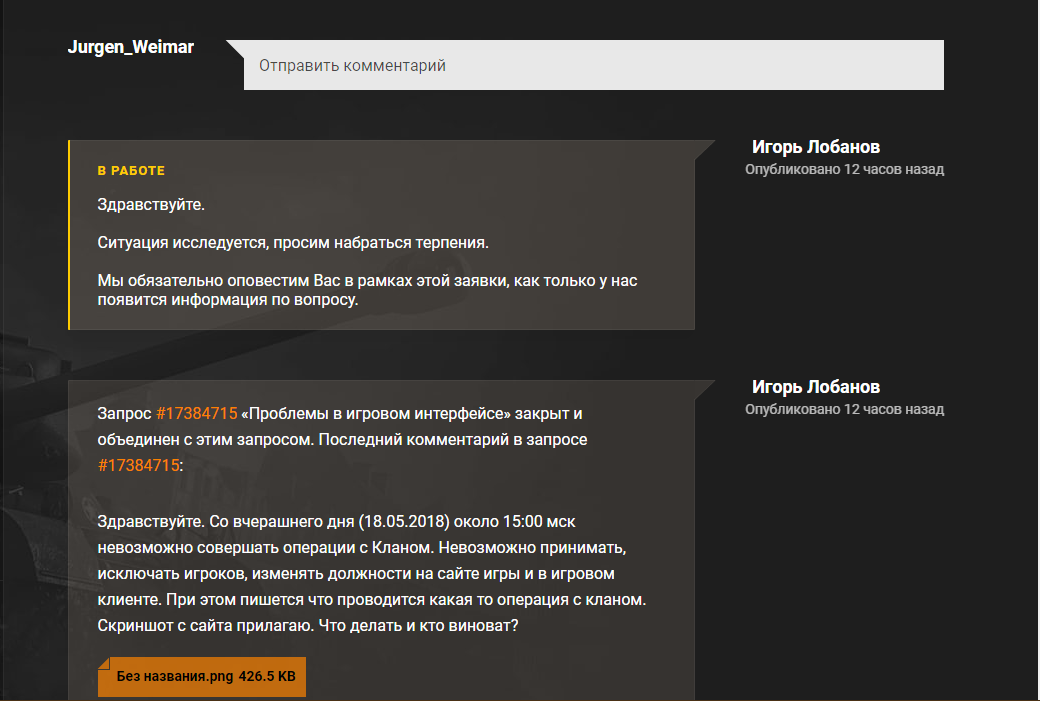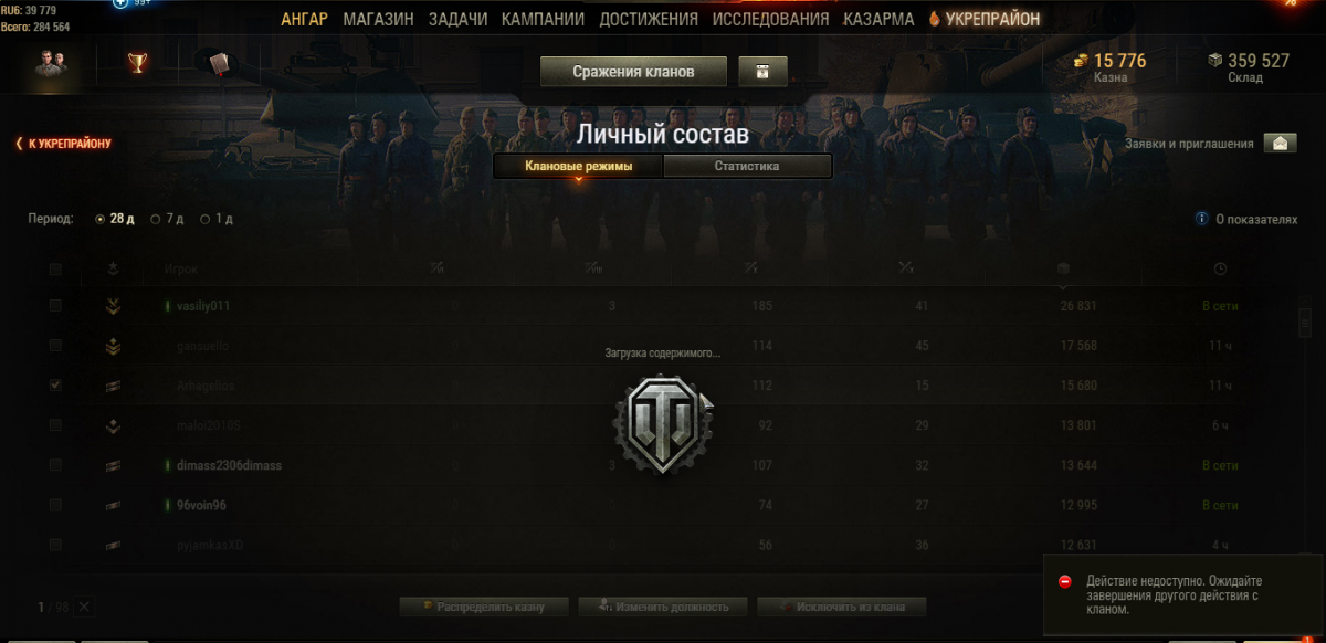 Здравствуйте. С (18.05.2018) около 15:00 мск невозможно совершать операции с Кланом. Невозможно принимать, исключать игроков, изменять должности на сайте игры и в игровом клиенте. При этом пишется что проводится какая то операция с кланом. Скриншот с сайта прилагаю. Что делать и кто виноват? В ццп не отвечают.
