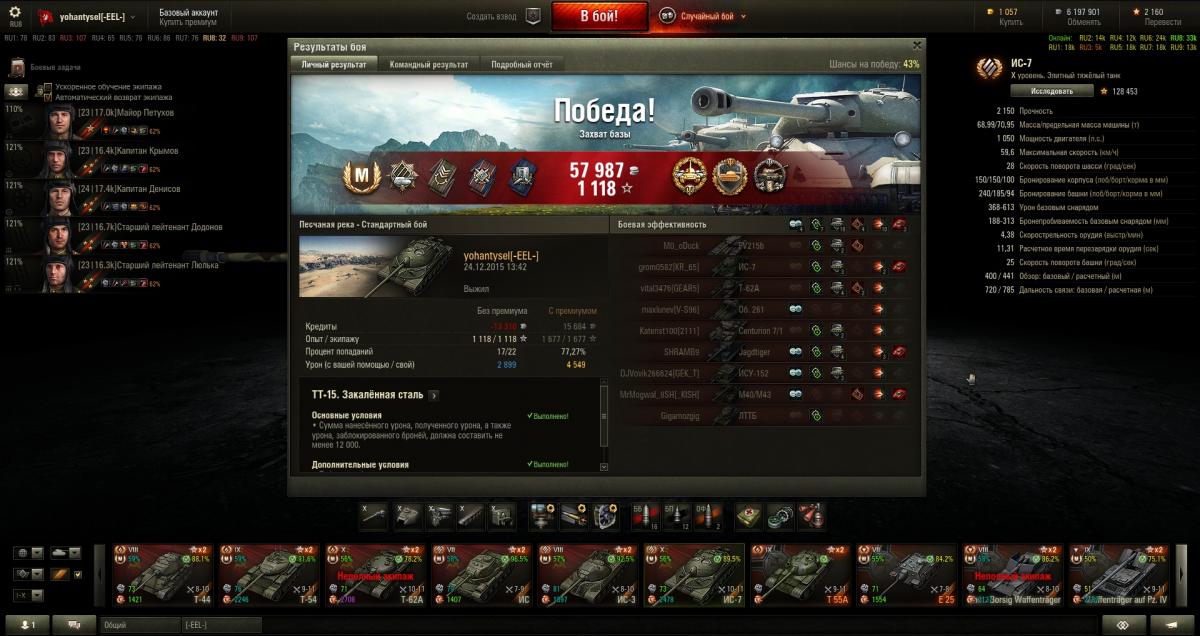 Наконец-то выполнил тт15 с отличием, много раз выполнял без отличия, ещё столько же не хватало буквально 100-300 урона для выполнения с отличием. Выполнял на своём единственном тяже ИС-7 и для данной лбз очень сильно решала карта, но в итоге выполнил. http://cdn-frm-eu.wargaming.net/wot/ru/uploads/monthly_12_2015/post-5035143-0-97144100-1450936926_thumb.jpghttp://cdn-frm-eu.wargaming.net/wot/ru/uploads/monthly_12_2015/post-5035143-0-94649000-1450936939_thumb.jpg http://wotreplays.ru/site/6939234#stats
