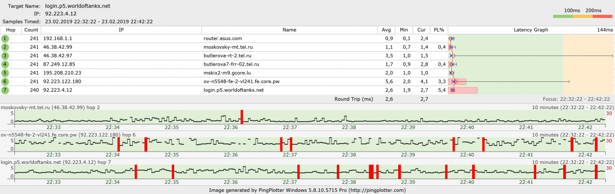 Добрый вечер. Долго и нудно переписывался с вашей тех.поддержкой, в итоге создалось стойкое ощущение, что ребята несколько... лукавят. Итак, ситуация: каждый вечер, часов так с 7-8 московские сервера ВГ получают статус "перегружены" http://cdn-frm-eu.wargaming.net/wot/ru/uploads/monthly_02_2019/post-5036879-0-90139500-1551202755_thumb.jpghttp://cdn-frm-eu.wargaming.net/wot/ru/uploads/monthly_02_2019/post-5036879-0-83041400-1551202772_thumb.jpg в этот же момент при попытке пинговать сервера или сделать до них трассировку я вижу потери на 2х последних узлах dt-n5548-fe-2-vl251.fe.core.pw dt-sl-a39.fe.core.pw Как я понимаю, эти узлы - ваше оборудование. Провожу все пляски с бубном, которые просит тех.поддержка ВГ, отсылаю им все данные, в ответ мне заявляют, что у них проблем нет, сделали обратную трассировку, потери у меня (когда эту трассировку делали - вопрос, может в обед, когда всё ок; да и потери на обратной трассировке 1%, а вечерами у меня - до 10%). Я общаюсь со своим провайдером, они роют землю, что-то меняют на чердаке, выделают мне белый айпи - на своём участке проблем не видят. Трассировка по новой - проблемы на ваших узлах. Их вижу я, их видит техподдержка провайдера tel.ru, их не видит варгейминг. Ладно, допустим я ***, ВГ лапочки и проблема действительно у меня. Но блин, за соседним компом сидит жена, в ее онлайн-играх лагов вечерами нет. Но блин, пинг до серверов с потерями в 5-10%, пинг какого-нибудь яндекса в то же время - 0-1% потерь. Вот, к примеру, график пингплоттера. Потери на стороне tel.ru меньше 1%, потери на серверах ВГ - около 10%. http://cdn-frm-eu.wargaming.net/wot/ru/uploads/monthly_02_2019/post-5036879-0-39964300-1551203417_thumb.png Я прошу тех.поддержку ВГ связаться с моим провайдером и еще раз проверить все маршруты/возможные причины потерь пакетов. Что отвечает тех.поддержка провайдера? Да, ок, ждем письма от ВГ, будем искать. Что отвечает тех.поддержка ВГ - проблемы у вас временные, только вечерами, идите лесом (К сожалению, это невозможно. Рекомендуем Вам продолжить обсуждение ситуации с поддержкой Вашего поставщика услуг доступа в сеть Интернет, либо использовать для игры другое соединение. Надеемся на Ваше понимание в этом вопросе ). Быть может на форуме мне попадутся люди, которые объяснят, в чем я не прав?