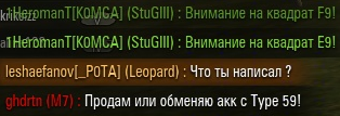2. Катаюсь по рандому и вижу сообщение о продаже или обмене аккаунта с Type 59. Вопрос: Бан будет ? http://cdn-frm-eu.wargaming.net/wot/ru/uploads/monthly_05_2013/post-5101552-0-83538800-1369708628_thumb.png Оригинал: http://cdn-frm-eu.wargaming.net/wot/ru/uploads/monthly_05_2013/post-5101552-0-28522600-1369708663_thumb.jpg