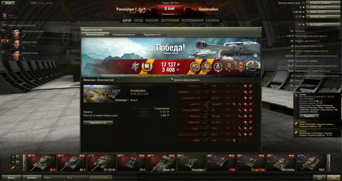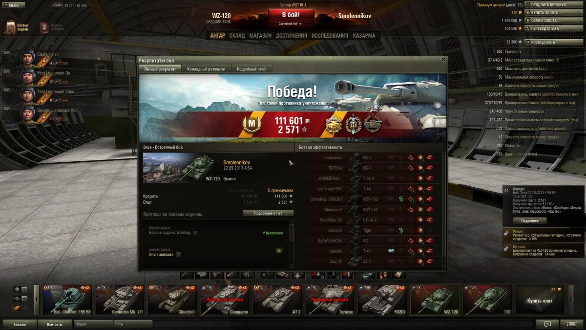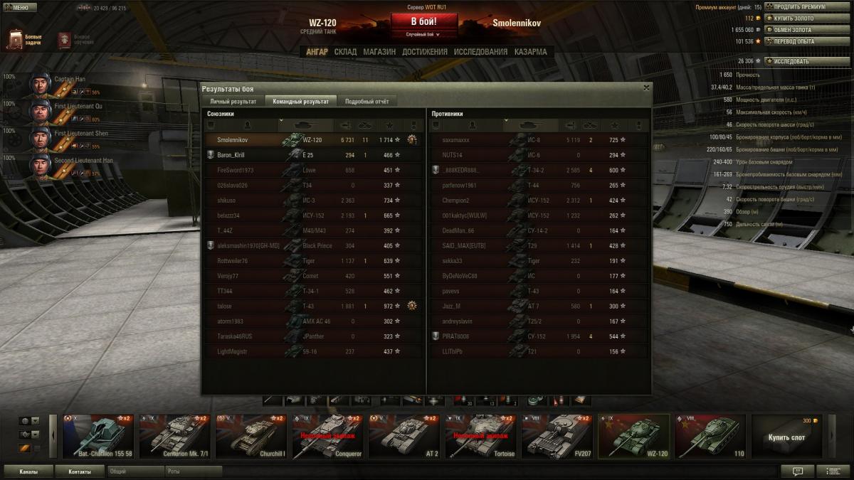 66-ой бой на WZ-120. Из модулей всё, кроме топ орудия и топ движка. В принципе, со 100мм 62-100Т очень даже не плохо, вероятно, при исследование топ 122мм ствола я вернусь к 100мм орудию. Тактика подобна Т-54, только корпус беречь надо ВСЕГДА и ВЕЗДЕ, ибо горит он через попадание, если не каждое попадание