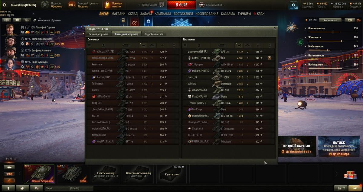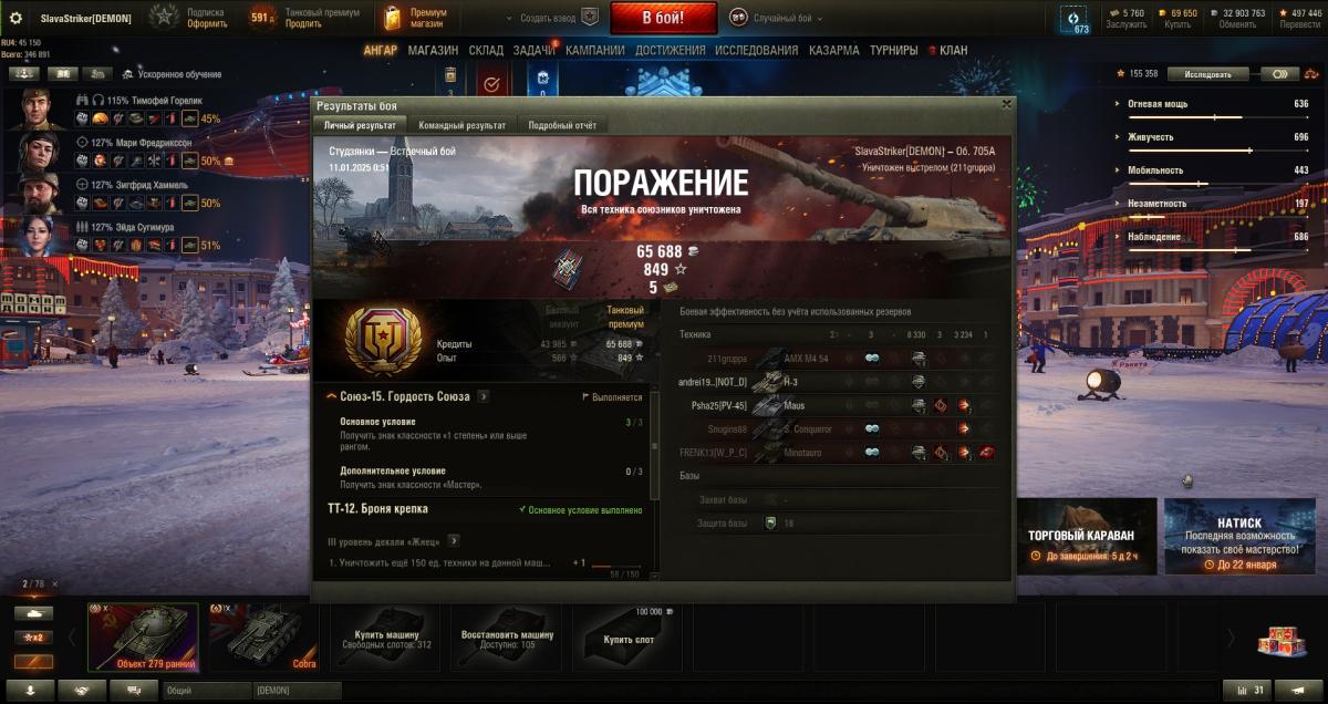 Выполнил ТТ12 на 705А. До этого несколько раз был на грани выполнения задачи, но как назло не хватало всего одной тычки. Оборудка: закалка, турбина, досыл. На чём я её только не пытался делать: Крайслер, Ис-4, Ис-7, Е100, Маус, Тайгер Маус, 60ТП, 279(р), Фаза, Чиф. Но получилось именно на 705А. Повезло, попалась карта Студзянки и упоранты, которые стреляли в мой ромб. Чуть было не сорвалось, осталось совсем немного ХП и на меня приехала Дробь, пытаясь таранить. В самый последний момент в меня пульнул Маус с рикошетом.