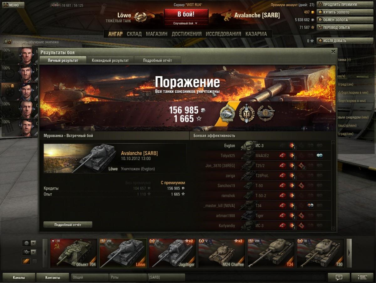 Всем доброго времени суток, вроде поставил рекорд при поражении на льве. Поражение Бой: Мурованка 10 октября 2012 г. 13:00:44 Танк: Löwe Получено опыта: 1 665 Получено кредитов: 156 985 Достижения в бою: Медаль Рэдли-Уолтерса, «Воин», «Снайпер» http://cdn-frm-eu.wargaming.net/wot/ru/uploads/monthly_10_2012/post-54983-0-57203100-1349840198_thumb.jpg http://cdn-frm-eu.wargaming.net/wot/ru/uploads/monthly_10_2012/post-54983-0-33646900-1349840242_thumb.jpg http://wotreplays.ru...ka-poligan-l_we