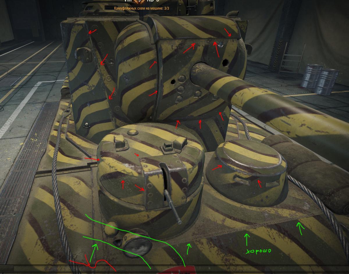 Добрый день, дорогие разработчики. Предлагаю починить отображение камуфляжей на технике. Речь идет о том, что сейчас камо отображается на танке не как единые линии/пятна через все элементы, плавно переходящие с корпуса на башню по всем ящикам/поручням/ком.башенкам и т.п., а как лоскутное одеяло, меняя направление и форму. (подробности на скрине) http://cdn-frm-eu.wargaming.net/wot/ru/uploads/monthly_05_2019/post-5195848-0-54679200-1556710318_thumb.jpg Красным отмечены участки где камо не стыкуется, зеленым где все хорошо. Было бы замечательно если бы пятна/полосы камо стали ровными и похожими на камо реальных машин (с точки зрения распространения) Пример правильного нанесения камо: