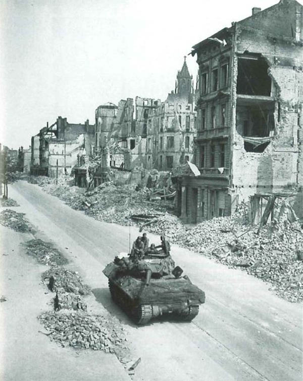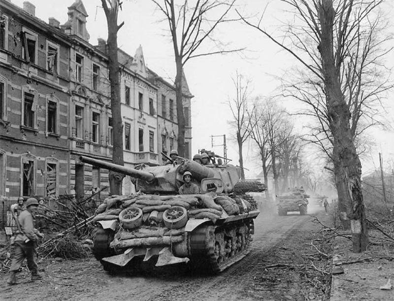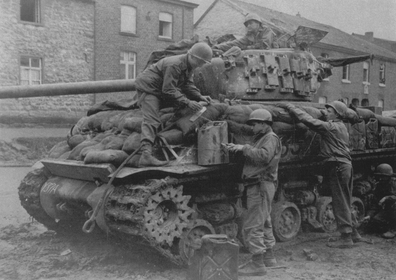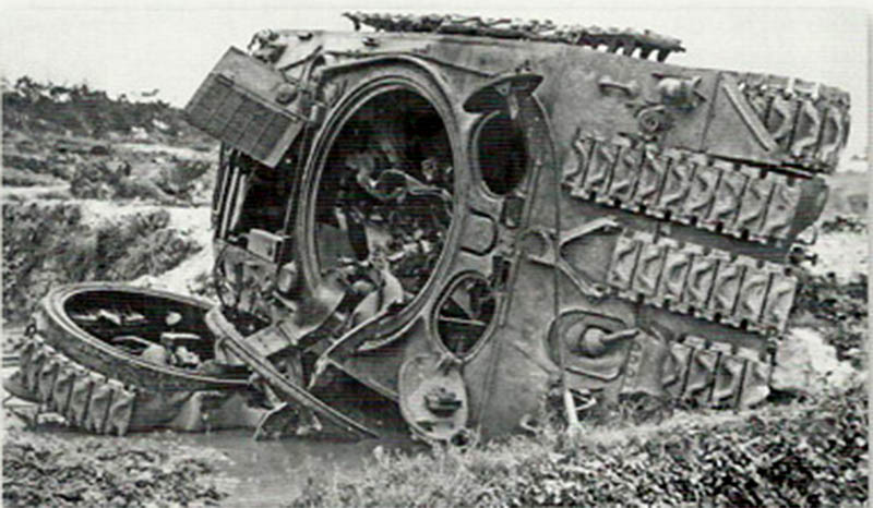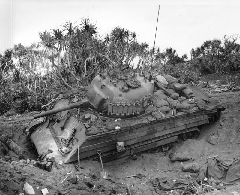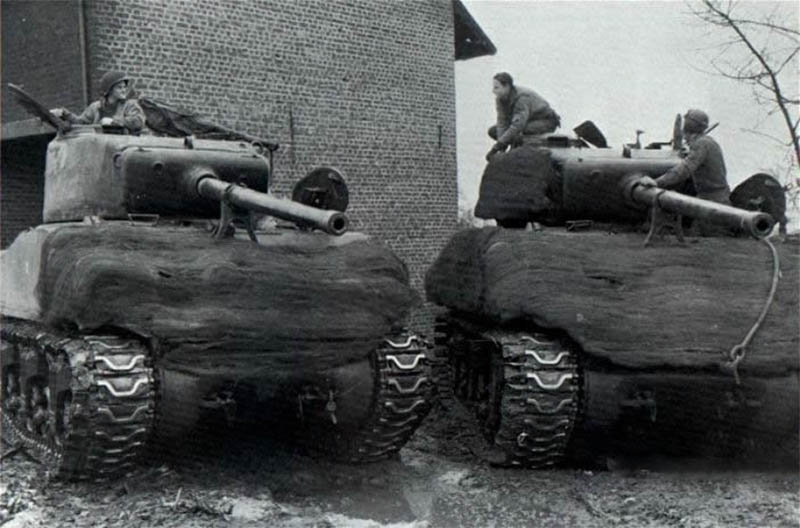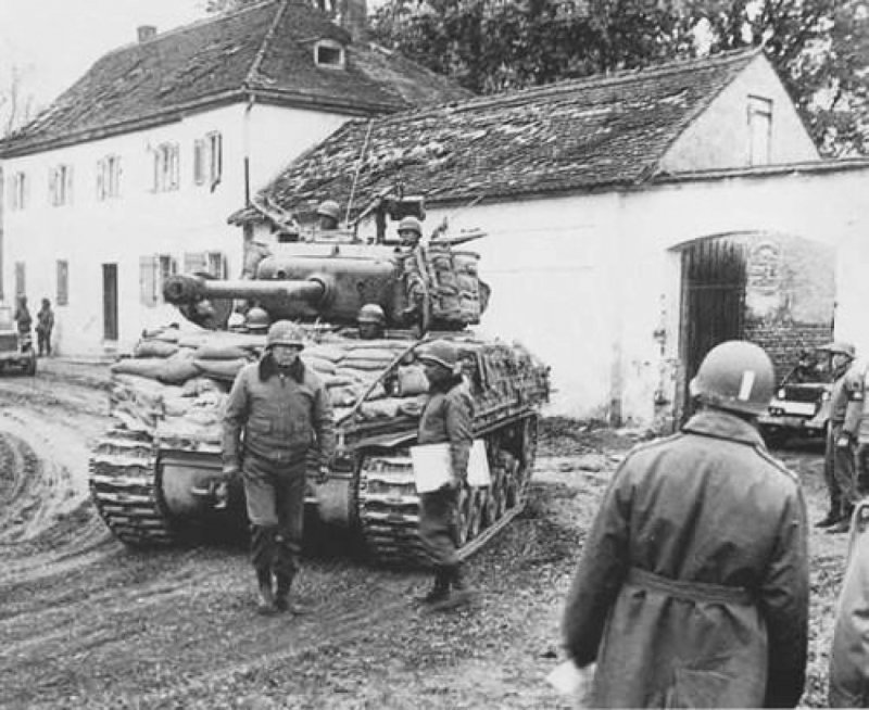 http://cdn-frm-eu.wargaming.net/wot/ru/uploads/monthly_12_2013/post-5222013-0-49132700-1387024652_thumb.jpg Хороший пример полевой защиты танков на Тихом Океане. Всевозможные люки и лючки снабжены вертикальными стальными штырями, башня прикрыта гусеницей, борт корпуса и ходовая - досками. Над двигательным отсеком и побокам от башни вех корпуса обсложен мешками с песком. Примечательно, что камуфляж наносился уже поверх импровизированных средств дополнительной защиты. 5-й Танковый Батальон был оснащён этими дополнительными средствами защиты ещё до высадки на Иводжиме. http://cdn-frm-eu.wargaming.net/wot/ru/uploads/monthly_12_2013/post-5222013-0-85288600-1387024870_thumb.jpgПример того, как в 3-й Танковой Армии Паттона раздели штурмовой танк М4 105мм. С не подлежащего восстановлению танка сняли броню и усилили защиту действующих танков. На верхнем крае спонсона, сразу под срезом орудия, виден след от попадания немецкого снаряда, который возможно уничтожил этот танк http://cdn-frm-eu.wargaming.net/wot/ru/uploads/monthly_12_2013/post-5222013-0-07613100-1387024981_thumb.jpg Разъярённый генерал Джордж Паттон направляется к своей штабной машине после нелицеприятного разговора с экипажем М4А3Е8 (76мм) из 14 Танковой Дивизии. Четырёхзвёздный генерал отругал танкистов, за то, что на танк навешены мешки с песком. Примечательно, что эта дополнительная защита была ещё в марте стандартизирована в 7-й Армии, но Паттон не желал с этим считаться. Генерал считал, что мешки с песком не обеспечивают хорошей защиты, перегружают машину, что ведёт к преждвременым поломкам. Когда 14-я Танковая Дивизия 22-23 апреля 1945 была передана из 7-й Армии в 3-ю Армию Паттона, генерал лично запретил подобные методы дополнительной защиты танков в подчинённых ему войсках. Впрочем танкисты расходились с генералом во взглядах на мешки с песком и часто просто игнорировали его приказ Японская куммулятивная мина на шесте имела конический некрашенный алюминиевый или стальной корпус с тремя шипами в донной части. Внутри мины находилась взрывчатка с куммулятивной воронкой, а в верхней узкой части размещался взрыватель. На мине мог быть стандартный взрыватель от ручной гранаты или комплект из капсуля, запала и детонатора. К вершине конической мины была привинчена металлическая трубка, в которую вставлялся деревянный шест с ударником на конце. Между детонатором и ударником находилась предохранительная скоба и меднная проволока. После выдёргивания предохранительной скобы, солдат, удерживая деревянный шест с противоположной от мины стороны, ударял шипами в цель с достаточной силой, чтобы смять медную проволоку между ударником и детонатором и разбить ударником капсуль в детонаторе. http://cdn-frm-eu.wargaming.net/wot/ru/uploads/monthly_12_2013/post-5222013-0-06612600-1387025329_thumb.jpg Куммулятивная струя пробивала до 6 дюймов брони, если корпус мины вплотную прилегал к поверхности цели. Если мина оказыывалась под углом 60 градусов от вертикали к поверхности цели, тогда пробивалось до 4 дюймов брони. http://cdn-frm-eu.wargaming.net/wot/ru/uploads/monthly_12_2013/post-5222013-0-94049600-1387025702_thumb.jpg Ремонтные подразделения 9-ой Армии разработали свой способ усиления бронезащиты. На броню приваривалась стальная гусеница толщиной 2 дюйма (5,08см), закладывалась сверху мешками с песком и всё это накрывалось маскировочной сеткой. Правый Шерман получил дополнительную защиту ещё по по бортам башни. М4А3 (76мм) из 747-го Танкового Батальона, возле Шляйдена, Германия, 31 января 1945 http://cdn-frm-eu.wargaming.net/wot/ru/uploads/monthly_12_2013/post-52220
