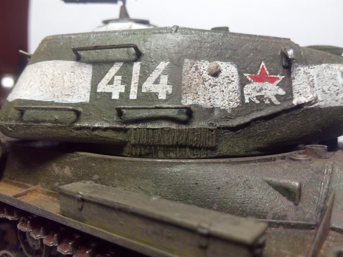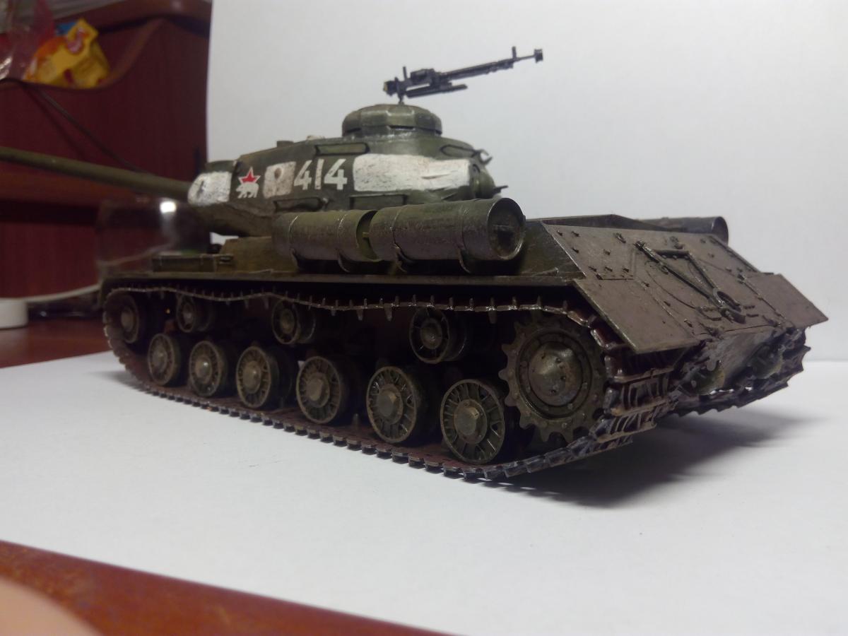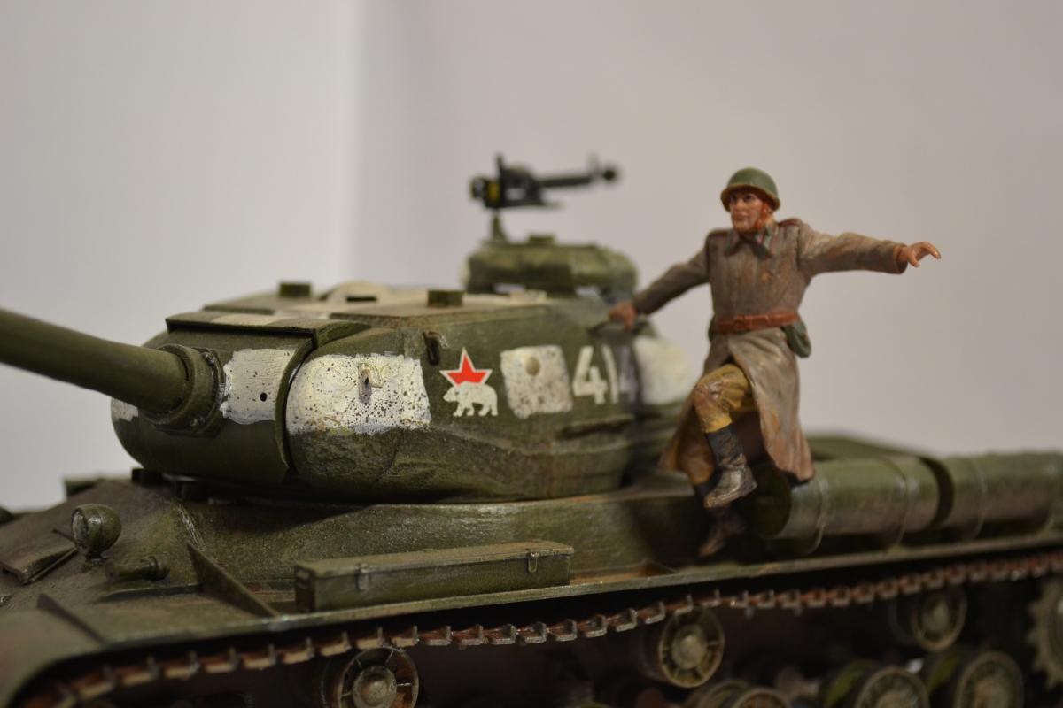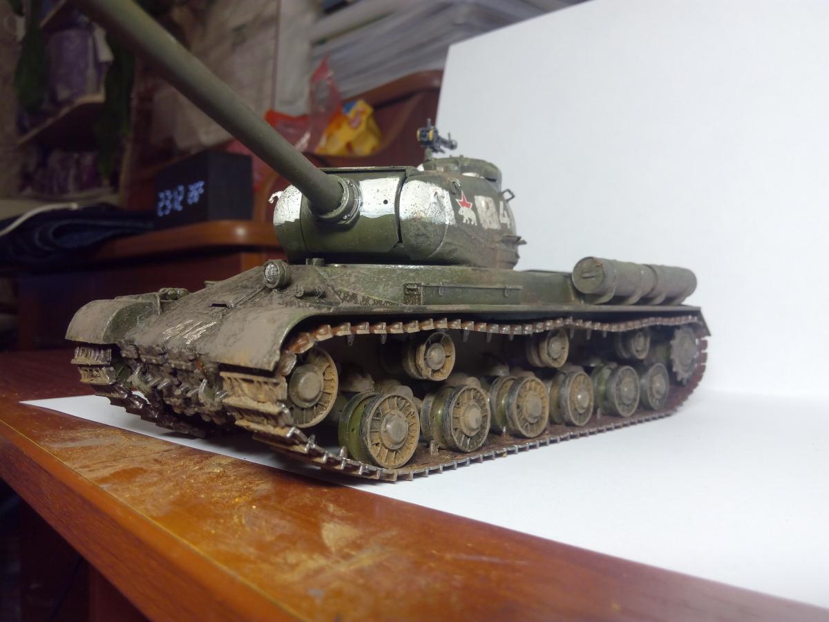 Покраска акрилом, кистью. Эффекты грязи и сажи - пастельные мелки растертые (только не восковые). Разводил спиртом, брызги грязи наносил старой зубной щеткой (вдохновили брызги от зубной пасты на зеркале Звезда и цифры - наклеиваемые декали из коробки. Согласен, косяков достаточно Хотелось попробовать и понять, зацепит или нет? Зацепило Некоторые детали надо было сначала красить, потом клеить, например катки. ну что такое грязь? Это пыль и вода Так что да! грязь настоящая Про надпись "боевые друзья" не знал, спасибо. Те фото которые нашел в интернете по данному танку сделаны только спереди. Правда на оригинальных фотографиях вместо доп. баков закреплены бревна и нет пулемета ДШК, не говоря уже про надгусеничные полки которые все искорежены, но во-первых это моя первая модель, сделанная для того чтобы понять насколько "зацепит", во-вторых баки ведь когда то были, не с завода же этот танк вышел с бревнами (это про свои мысли при работе над танком). А вообще, есть такая мысль, как взять за основу какую то реальную фотографию тех лет и сделать ее репродукцию. Ну а пока сейчас занимаюсь склейкой ИСУ-152 от Тамии и поглядываю на этот ИС-2 в плане переделать траки на наборные и заменить пулемет Но... время, время...