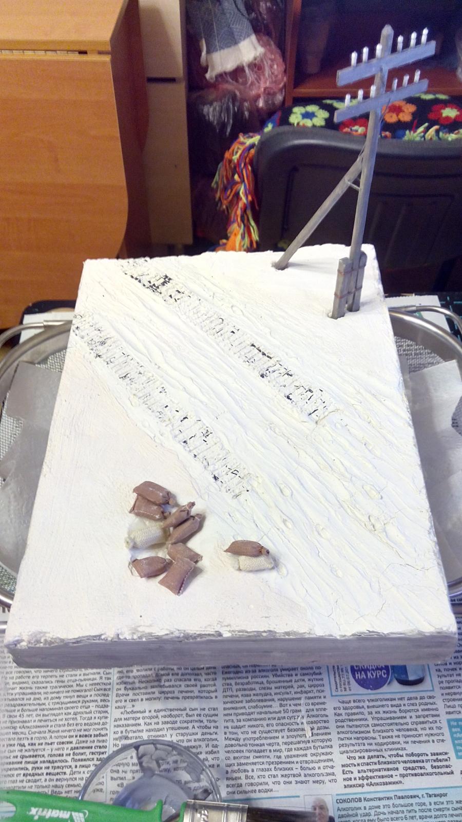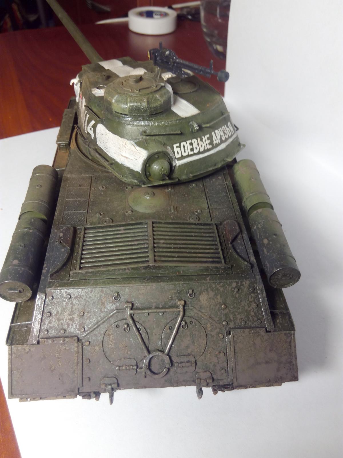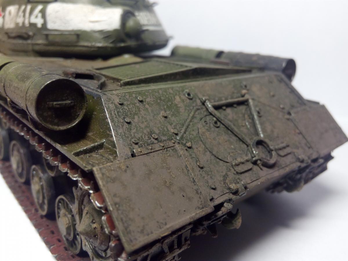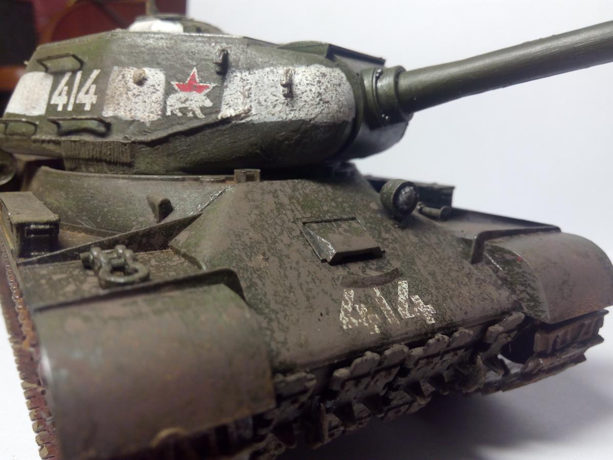 Покраска акрилом, кистью. Эффекты грязи и сажи - пастельные мелки растертые (только не восковые). Разводил спиртом, брызги грязи наносил старой зубной щеткой (вдохновили брызги от зубной пасты на зеркале Звезда и цифры - наклеиваемые декали из коробки. Согласен, косяков достаточно Хотелось попробовать и понять, зацепит или нет? Зацепило Некоторые детали надо было сначала красить, потом клеить, например катки. ну что такое грязь? Это пыль и вода Так что да! грязь настоящая Про надпись "боевые друзья" не знал, спасибо. Те фото которые нашел в интернете по данному танку сделаны только спереди. Правда на оригинальных фотографиях вместо доп. баков закреплены бревна и нет пулемета ДШК, не говоря уже про надгусеничные полки которые все искорежены, но во-первых это моя первая модель, сделанная для того чтобы понять насколько "зацепит", во-вторых баки ведь когда то были, не с завода же этот танк вышел с бревнами (это про свои мысли при работе над танком). А вообще, есть такая мысль, как взять за основу какую то реальную фотографию тех лет и сделать ее репродукцию. Ну а пока сейчас занимаюсь склейкой ИСУ-152 от Тамии и поглядываю на этот ИС-2 в плане переделать траки на наборные и заменить пулемет Но... время, время...