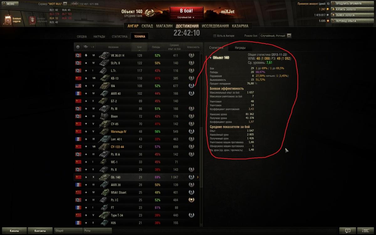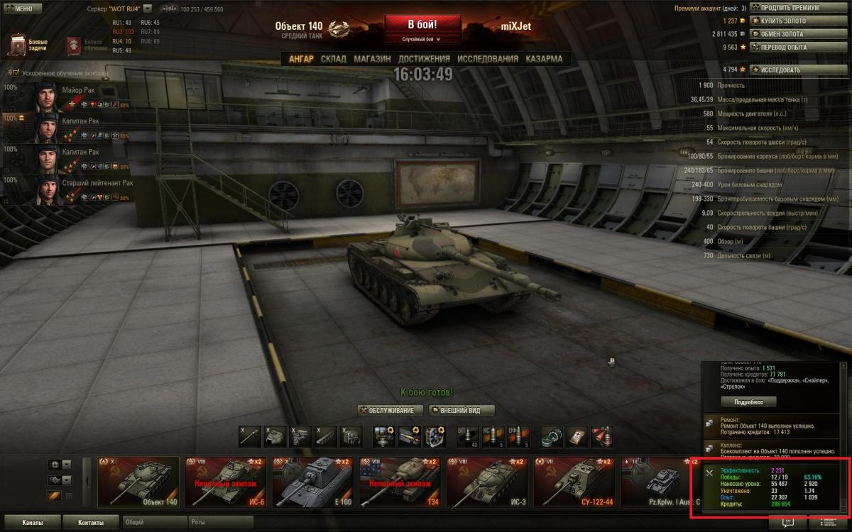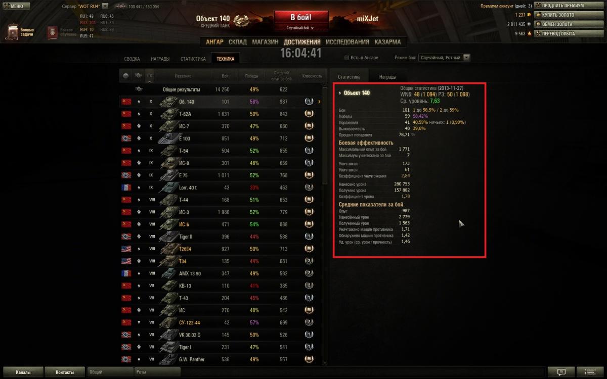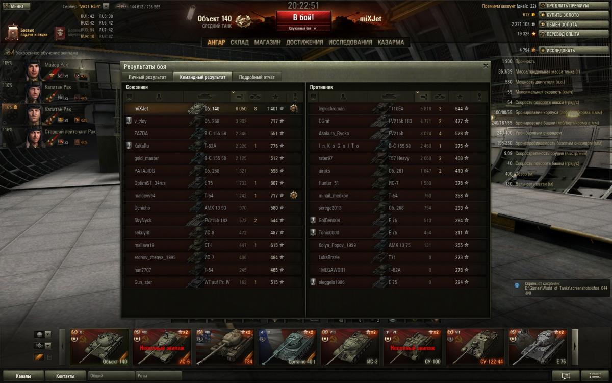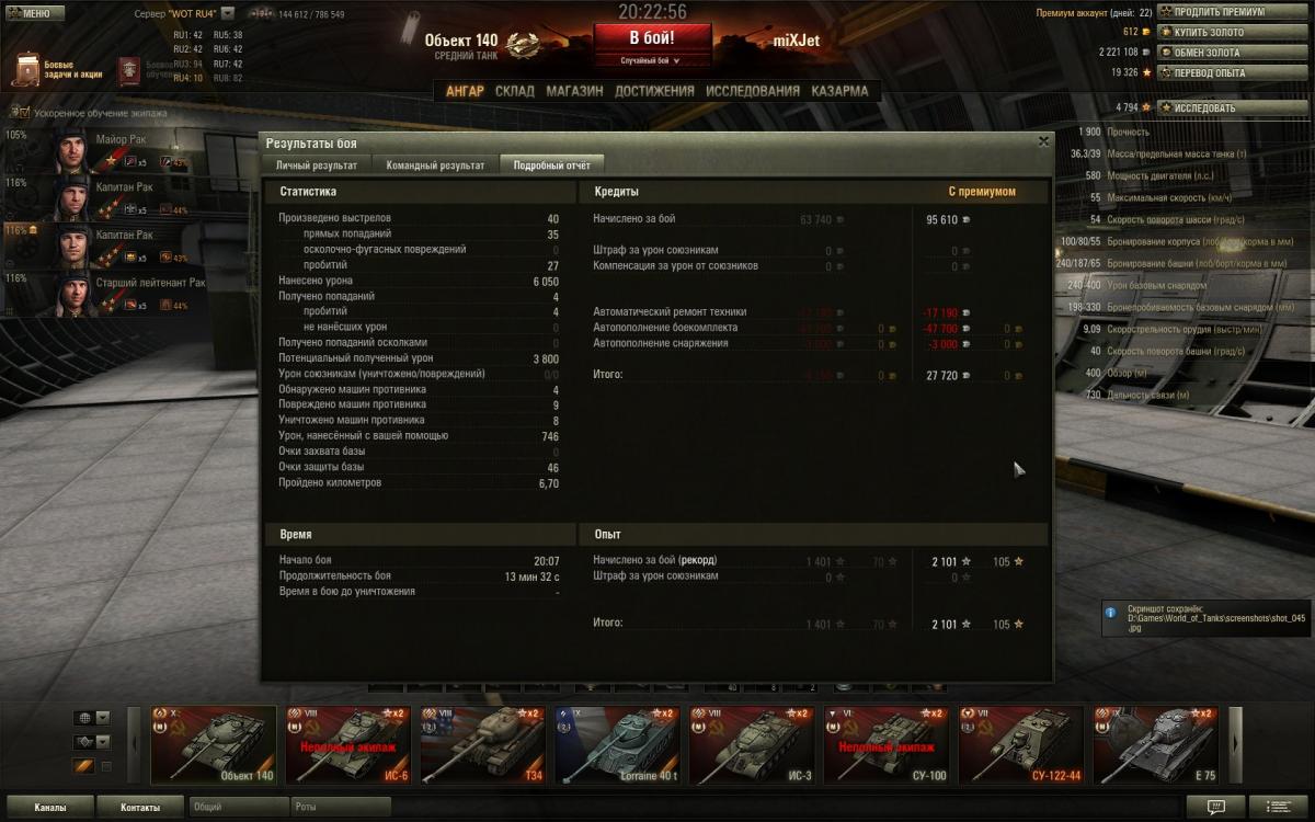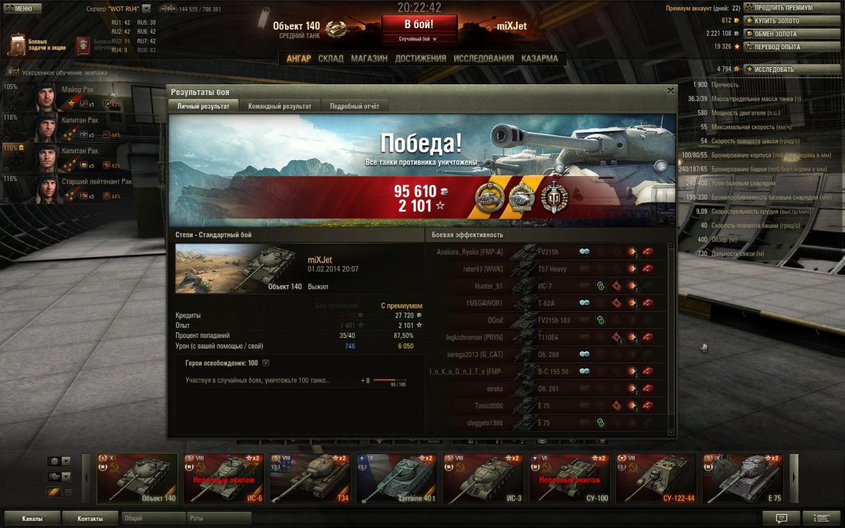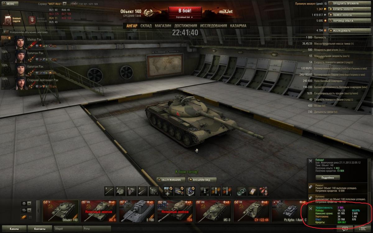 Вот решил поделиться еще раз впечатлением об Об.140. По моему мнению танчик поинтересней 62ки. Во первых как мне показалось с УВН у него всё лучше, габариты самого танчика меньше, также его более низкий силует - тоже большой плюс, максимальная скорость выше вроде как всего на 5 км/ч, но это как мне показалось достаточно ощутимо, и теперь на 100% убедился что действительно рикошеты сорока ловит чаще от ВЛД, и всё это делает игру гораздо комфортней. А такие минусы как слабое бронирование башни, так этот момент нивелируется тем, что сама башня более плоская и пробивается она как правило в лючки, а если двигаться всё время то выцелить эти лючки крайне сложно, а если уж говорить про то что сейчас на голде играть является делом вполне обыденным, то уж если какой-нибудь 268 зарядит голду то там и башня 62ки треснет. А остальные минусы, как скорость поворота башни и разворот танка на месте - совсем не существенные. И кстати, за 101 бой мной отыгранный на 140, горел раз 5-6 не больше, что значительно реже чем на моей памяти помнится как было на 62ке, на ней раз 20 если не больше горел за 100 боев если взять такое соотношение. http://cdn-frm-eu.wargaming.net/wot/ru/uploads/monthly_11_2013/post-5248818-0-83896500-1385803563_thumb.jpg http://cdn-frm-eu.wargaming.net/wot/ru/uploads/monthly_11_2013/post-5248818-0-10800800-1385803549_thumb.jpg
