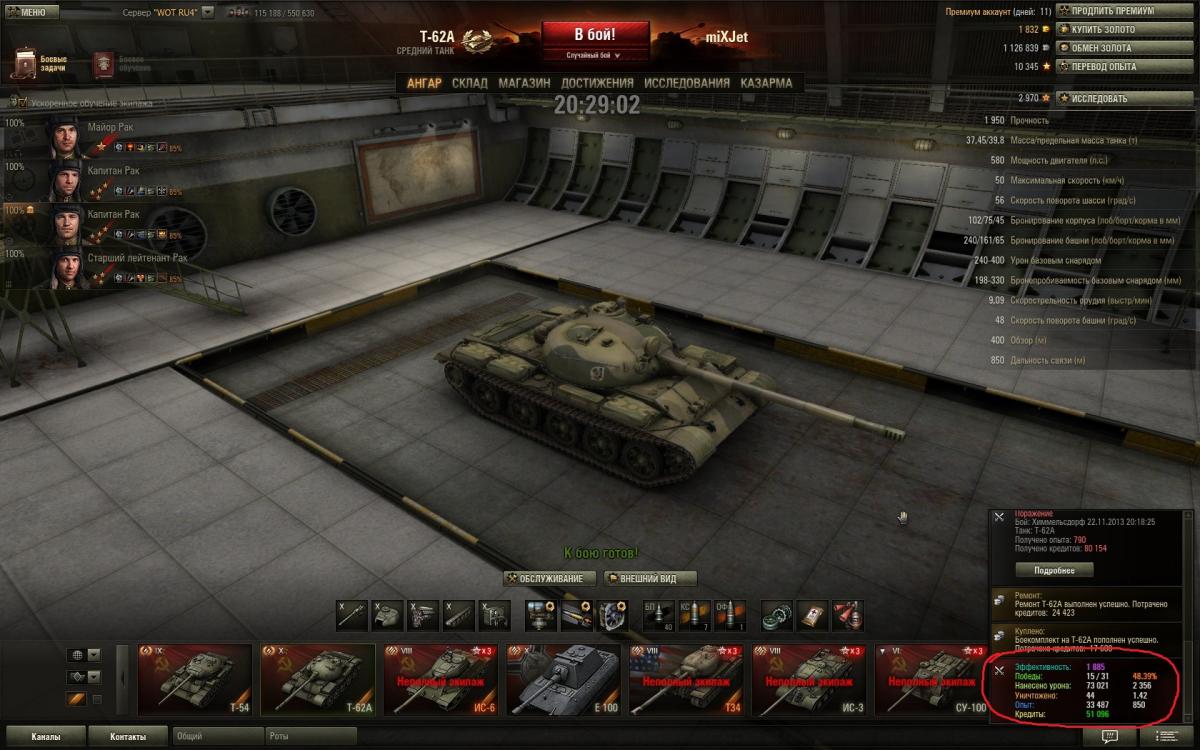 В общем вывод напрашивается сам. Всё таки наверно средние танки это не моё, ибо вот для сравнения, сегодня отыграл сессию из 20 боев на Е100, результат 15 побед. Вчера на 62ке из 31 боя 15 побед. Сегодняшняя сессия на Е100 http://cdn-frm-eu.wargaming.net/wot/ru/uploads/monthly_11_2013/post-5248818-0-76199900-1385198751_thumb.jpg Вчерашняя на Т-62А http://cdn-frm-eu.wargaming.net/wot/ru/uploads/monthly_11_2013/post-5248818-0-99309200-1385198697_thumb.jpg