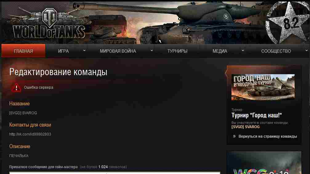 5. Ошибка редактирование Город наш. Не могу отправить сообщения для гейм-мастера, пишет ошибку сервера!