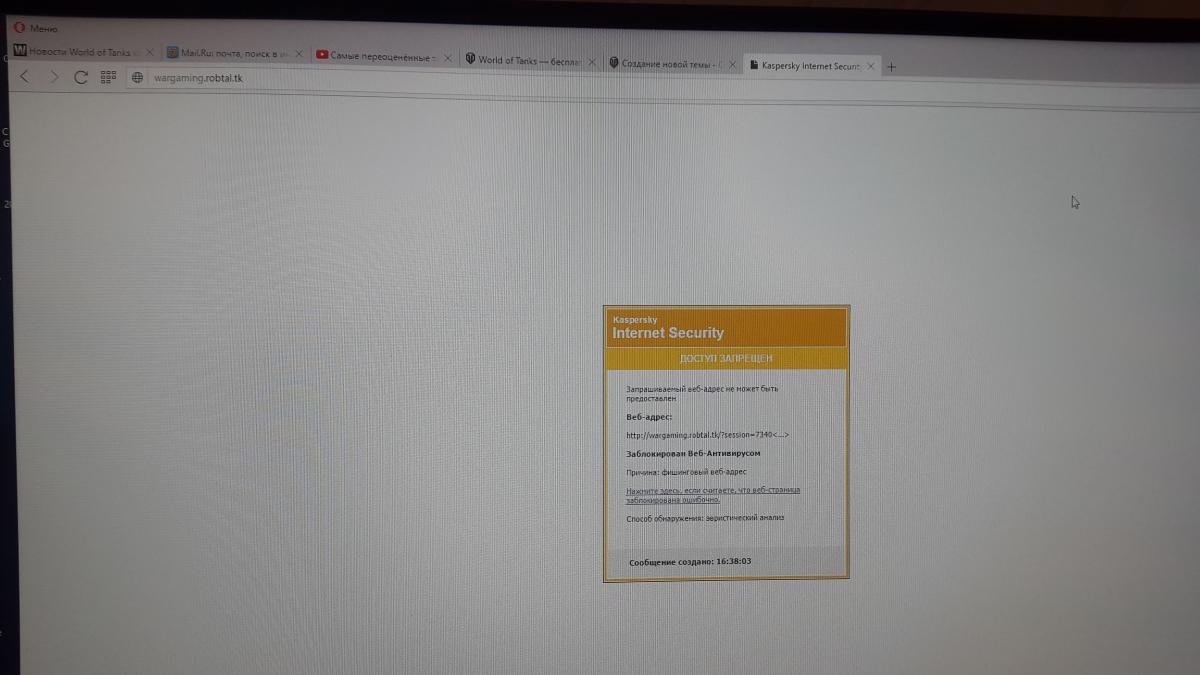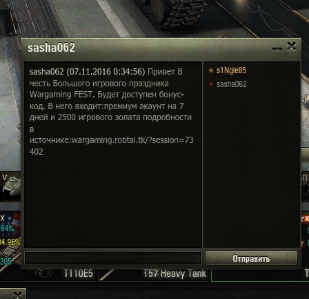 Написал в личку sasha062 : "Привет В честь Большого игрового праздника Wargaming FEST. Будет доступен бонус-код. В него входит:премиум акаунт на 7 дней и 2500 игрового золата подробности в источнике:wargaming.robtal.tk/?session=73402" Зайти по ссылке не удалось, Касперский заблокировал. Это мошенник ?