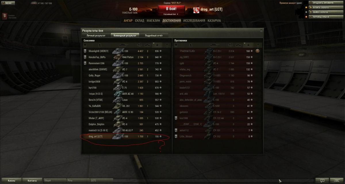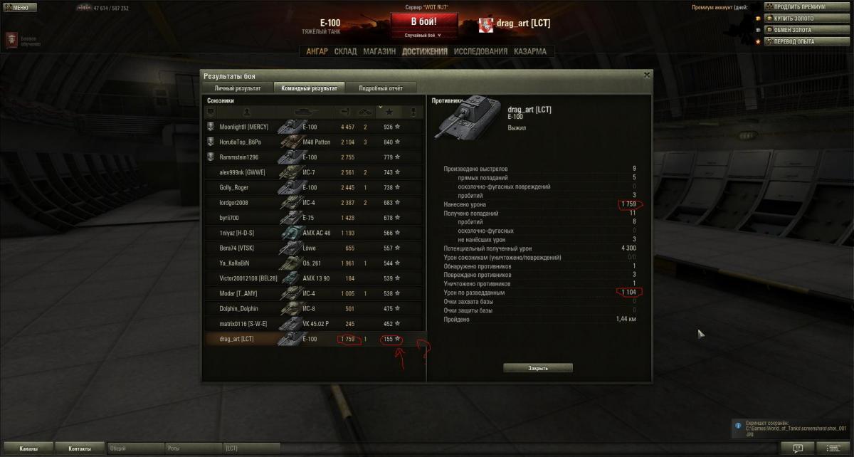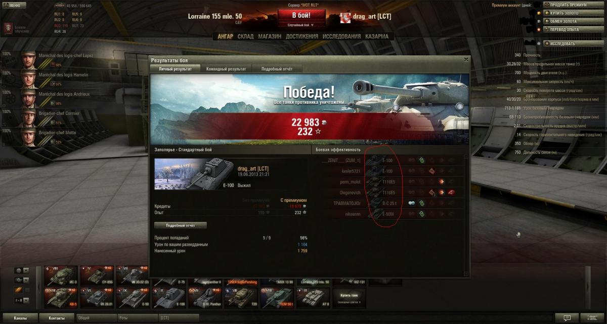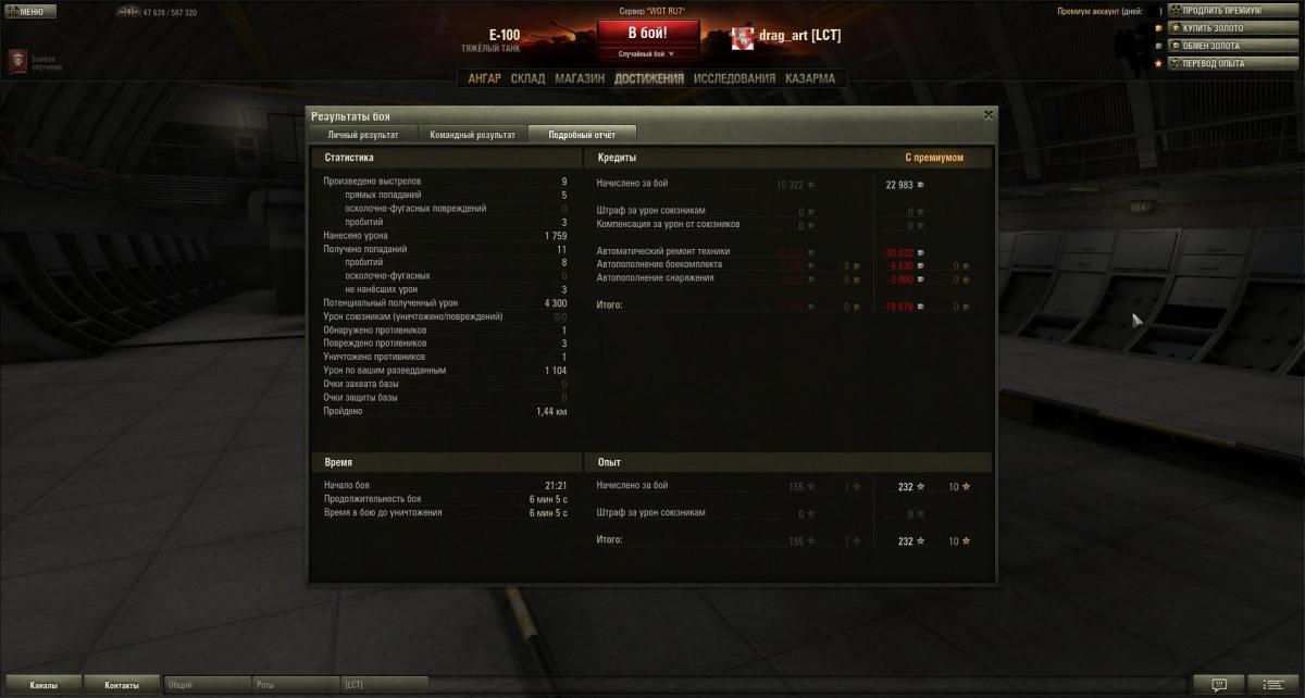 Бой на е100. В течение боя мною было нанесено 1759 урона и 1104 по разведданным. Моя команда побеждает в нём. За победу начислили всего лишь 22983 серебра (с премиум аккаунтом) и 232 опыта (155 чистыми). Возникает вопрос, почему же так мало? Конечно, не сногшибательные показатели, лично для меня бой был не очень удачным, однако такое малое количество кредитов и опыта за такие действия я считаю слишком малыми. Возможно, в игре баг