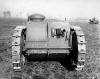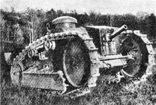 на полуэллиптической рессоре. Ведущее колесо — заднего расположения, зацепление гусеницы — зубовое. Направляющее колесо большого диаметра было вынесено вперед и вверх, гусеничный обвод выступал за пределы корпуса. Для повышения проходимости сзади крепился откидной «хвост». Как видим, здесь использованы те же идеи, что и в танке Рено, но с другим конструктивным оформлением. Для наблюдения служил возвышающийся над гусеничным обводом грибовидный колпак со смотровыми щелями.