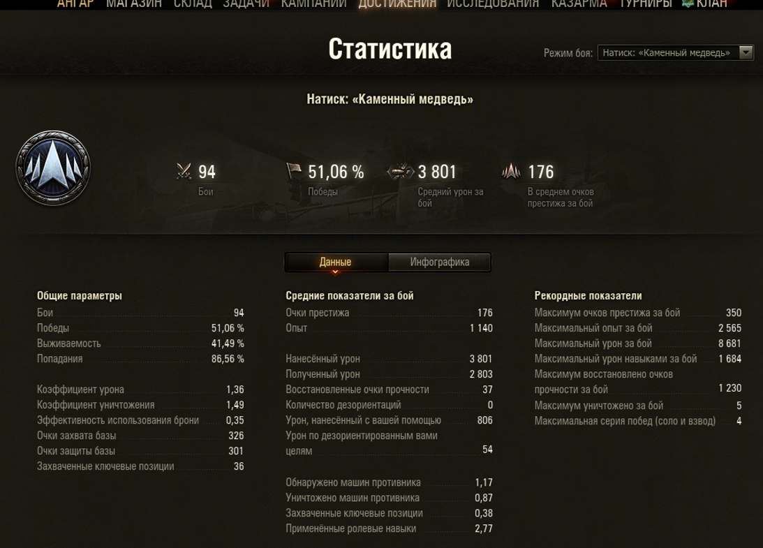 Статка из надриска среднего игрока, 51% (на выбор танков союзниками и тактику боя мы не может повлиять, следовательно % побед от нас практически не зависит, что крайне печально и вводит в лютое уныние) 96 боев - 1100 очков... и это еще поднял пару соток, несколько дней просто на одном месте очки были. Однозначно должно быть больше очков за победу, либо меньше отнимать за поражение, в том виде что сейчас - это издевательство над игроками. Не нравится, не играй? Согласен, но мне нужен танк Wilk, который я немогу получить другим способом, иначе и не играл бы в этот режим нервотрепки. И негатив к этому режиме у абсолютного большинства игроков, меняйте что-то в позитивную сторону если вам нужно увлечь игроков, перестаньте игру в страдание, боль и унижение превращать!