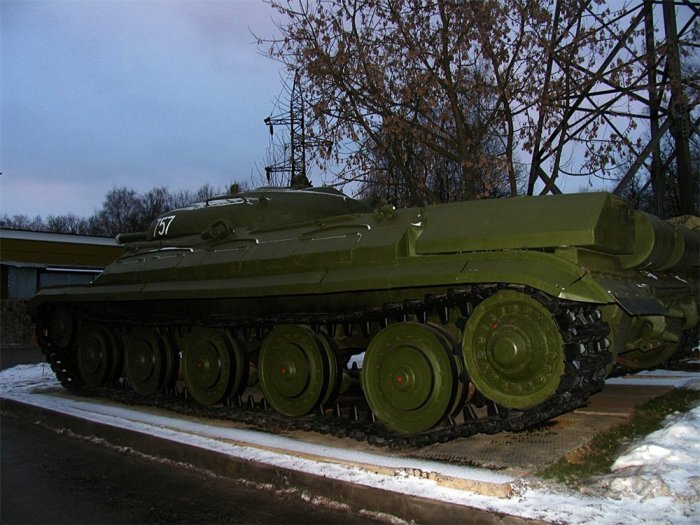 В мире в целом и в СССР в частности создавалось большое количество различных видов экспериментального оружия. Подавляющее большинство из них были только на бумаге или воссоздавались в единичных экземплярах. Если разрабатываемое оружие удовлетворяло выдвигаемым требованиям, оно шло в серию, в противном случае экспериментальный образец отправлялся на «хранение» (в музеи, институты или оставлялся на полигоне) либо попросту уничтожался. Долгое время считалась, что такая судьба постигла и экспериментальный ракетный тяжелый танк «Объект 757», однако несколько лет назад на окраине одного из военных полигонов была найдена эта поистине уникальная машина. Несмотря на то, что машина была создана более полувека назад, она довольно хорошо сохранилась, но специалисты столкнулись с другой проблемой – не сохранилось технической документации на «Объект 757». Машина была отреставрирована, и теперь она является экспонатом "Музея Техники" в Красногорском районе, п. Архангельское. Вот то немногое, что удалось отыскать об экспериментальном ракетном тяжелом танке «Объект 757». http://cdn-frm-eu.wargaming.net/wot/ru/uploads/monthly_03_2013/post-58227-0-40983600-1363515626_thumb.jpg Необходимость разработки такой машины была продиктована наличием с составе советских танковых войск тяжелых танков для поддержки, которых огнем противотанковых ракет была необходима машина, имеющая аналогичный линейным танкам уровень защиты. На тот момент существовали образцы ракетных танков, которые базировались на базе средних танков, что исключало возможность использования их в одном строю с тяжелыми танками. http://cdn-frm-eu.wargaming.net/wot/ru/uploads/monthly_03_2013/post-58227-0-54737200-1363515698_thumb.jpg В конструкции танка "Объект 757" были использованы узлы и агрегаты тяжелого танка Т-10М и опытного танка «Объект 770». В 1959 году изготовили опытный образец машины. Образец ракетного тяжелого танка «Объект 757» прошел заводские и полигонные испытания, но в 1961 году машинку прикрыли. Тактико-технические характеристики: Боевая масса – 44 т; Экипаж – 3 человека; Бронирование: Лоб корпуса – 120 мм; Борт корпуса – 50..80 мм; Башня – 30..90 мм; Вооружение: Марка и калибр пушка – Д-126С, 125 мм; Марка и калибр пулемёта – СГМТ, 7,62 мм (спаренный); Дальность стрельбы: ПТУР — до 4000 м (4-5 выстр./мин); НУРС — до 9000 м (8-10 выстр./мин); Подвижность: Тип двигателя – В12-6Ф; Мощность двигателя – 800 л.с.; Скорость по шоссе – 65 км/ч; Запас хода по шоссе – 400 км. Двигатель:12-цилиндровый 4-х тактный 850-сильный дизельный двигатель В-12-6Ф с эжекционной системой охлаждения Трансмисия:гидромеханическая трансмиссия и система гидросервоуправления Все это позволяло разгонятся до 65км/ч Шасси танка «Объект 757» для своего времени было довольно революционным. В гусеничном движителе использовалось пять опорных катков большого диаметра (на один борт) с внутренней амортизацией и гусеницы с открытым металлическим шарниром А теперь вооружение: 125 мм нарезная пушка Д-126С Для ведения огня использовались управляемые ракеты противотанкового ракетного комплекса «Рубин» и неуправляемые активно-реактивные снаряды «Бур», имеющие осколочно-фугасную боевую часть. http://cdn-frm-eu.wargaming.net/wot/ru/uploads/monthly_03_2013/post-58227-0-99158800-1363516088_thumb.jpg ракета была способна пробивать стальные вертикально расположенные бронелисты толщиной 500миллиметров Скорострельность:4 - 5 выстрелов в минуту Снаряд «Бур» (скорость полета – 650..750 м/с). Скорострельн