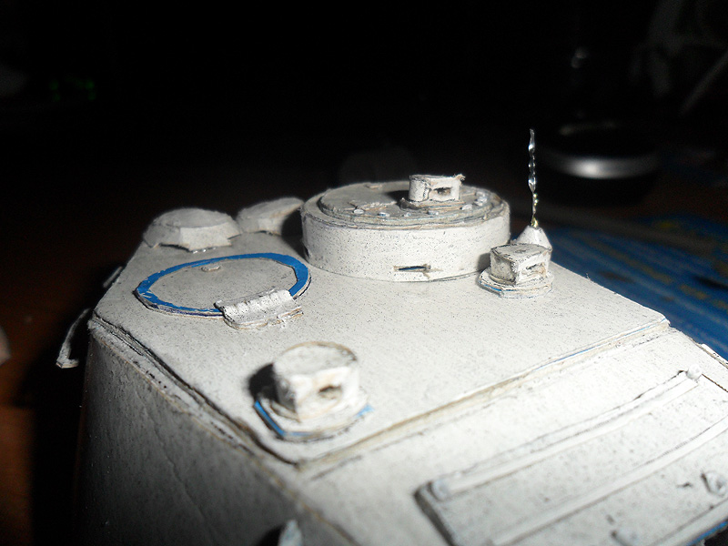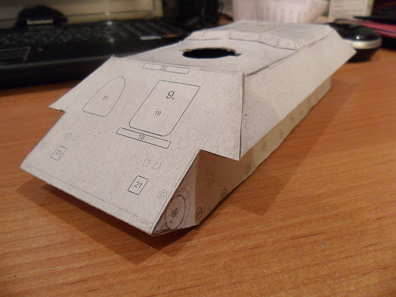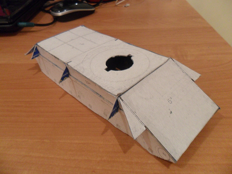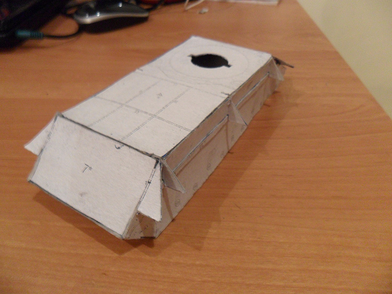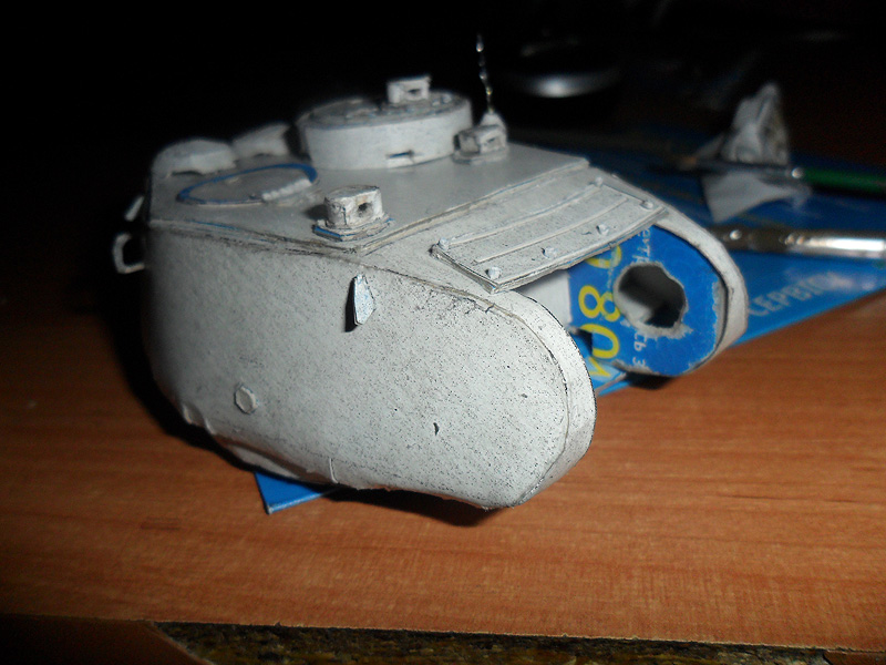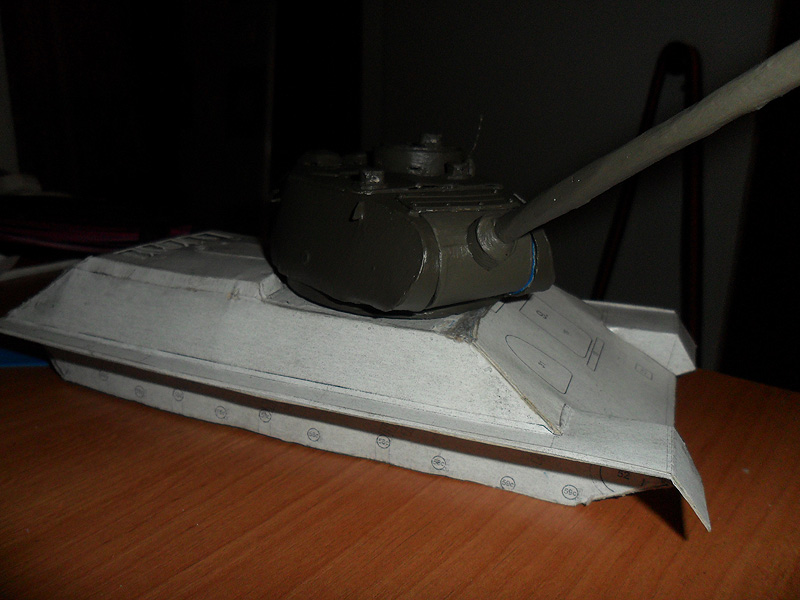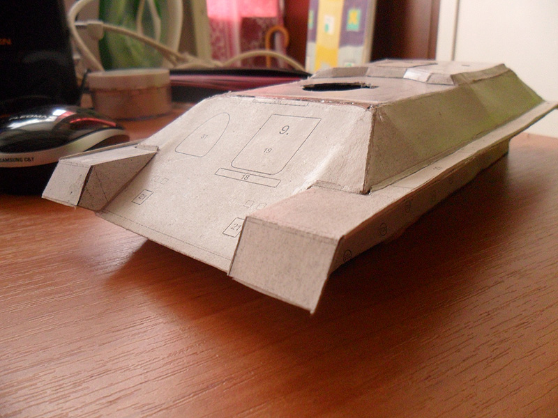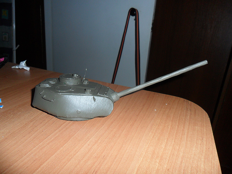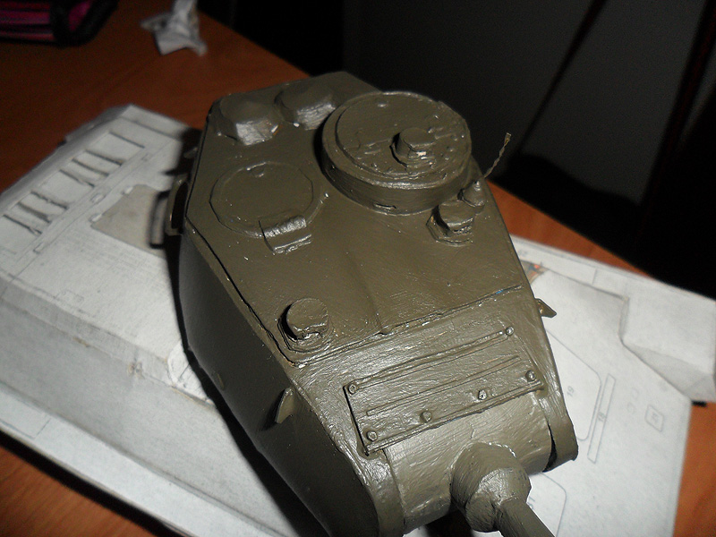 Все же решил переделать свою модель танка и более щипетильно отнестись к его производству. Вот что на данный момент получается http://cdn-frm-eu.wargaming.net/wot/ru/uploads/monthly_12_2012/post-5494290-0-60887700-1355237606_thumb.jpeg http://cdn-frm-eu.wargaming.net/wot/ru/uploads/monthly_12_2012/post-5494290-0-20819100-1355237608_thumb.jpeg http://cdn-frm-eu.wargaming.net/wot/ru/uploads/monthly_12_2012/post-5494290-0-58968100-1355237609_thumb.jpeg http://cdn-frm-eu.wargaming.net/wot/ru/uploads/monthly_12_2012/post-5494290-0-88548400-1355237610_thumb.jpeg Для создания грубой литой брони я не стал обклеивать башню туалетной бумагой, а решил произвести окраску с помощью губки - эффект виден на фото. И что бы модель танка не виглядела доволи плоской, решил воссоздать кое-какие рельефы на определенных участках модели, например на последнем фото видно часть проделаной работы по рельефу маски орудия.