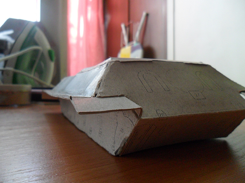 При любом раскладе клеить нужно из картона - офисная бумага размокает от клея и не держит форму. Я использую не толстый картон (покупал набор белого картона из 10 листов) - что бы он был по зубам принтеру. Для особой жесткости изначально вырезал корпус, а потом наклеил на предварительно склеенные 2 листа, т. е. у меня получилась трехслойная выкройка.