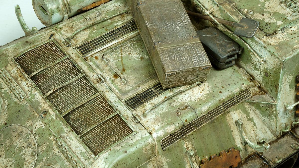 Добрый вечер!Модель от фирмы Звезда.Сборка из коробки с некоторыми дополнениями:1. Катки - MSD.2. Поручни - проволока.3. Фактура брони - шпаклевка. 4. Ящик - MiniArt.5. Канистра - Tamiya.Окраска акрилом тамии.