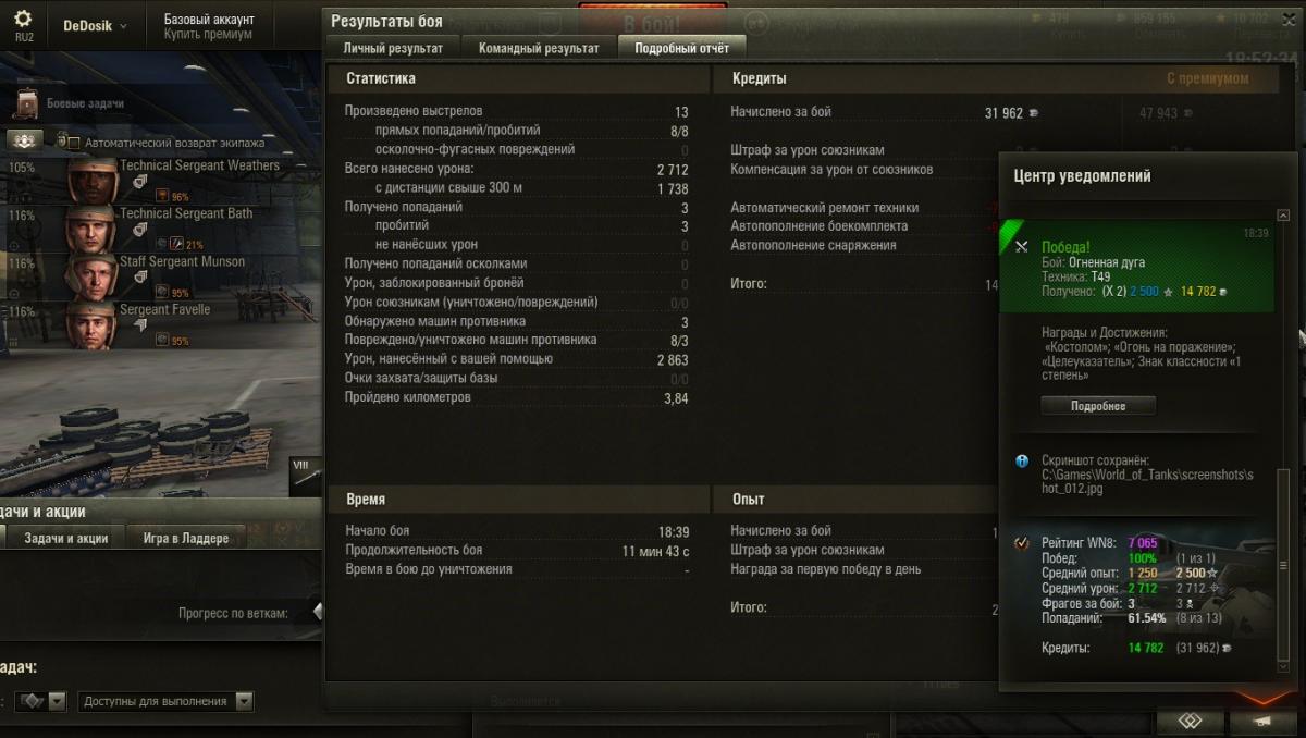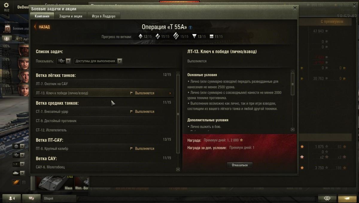 Доброго вечера форумчане! У меня очередной казус с лбз. Выполнил все условия - задачу не засчитали. Задача на "55а" : лт-13 . Описание задачи: Лично (или суммарно взводом, состоящим из вашего лёгкого танка и любой другой техники) передать разведданные для нанесения не менее 2500 урона и нанести не менее 2000 урона технике противника. Лично выжить в бою. Победить в бою. Вопрос: Стоит ли писать в ЦПП и были ли прецеденты когда засчитывали задчу,после обращения в ЦПП с таким вопросом? Понятное дело,что можно выполнить еще раз. Но хочется ответа,почему не была засчитана задача. Ниже прикреплю скрины и ссылку на реплей. п.с. с ответами типо "рак забыл включить задачу"- идите лесом. Ссылка на реплей : http://wotreplays.ru/site/6611652#ognennaya_duga-dedosik-t49