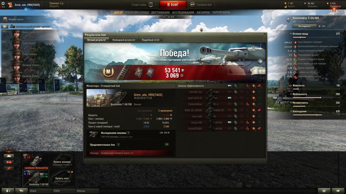 Ну что, прошел чеха. Играл боев 20-30 в стоке потом в топ вывел, По модулям Досылатель, Просветленная оптика, Усиленные приводы наводки Экипаж так и не вкачал , на скрине виден мой крайний бой ср урон и % побед по тунку http://wotreplays.ru/site/8854359#monastyr-grom_ada_vrn-kon_trukta_t-34_100